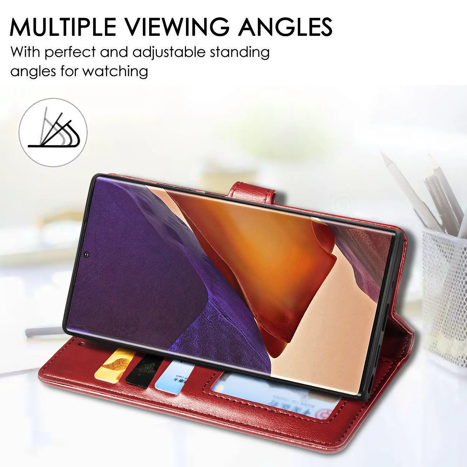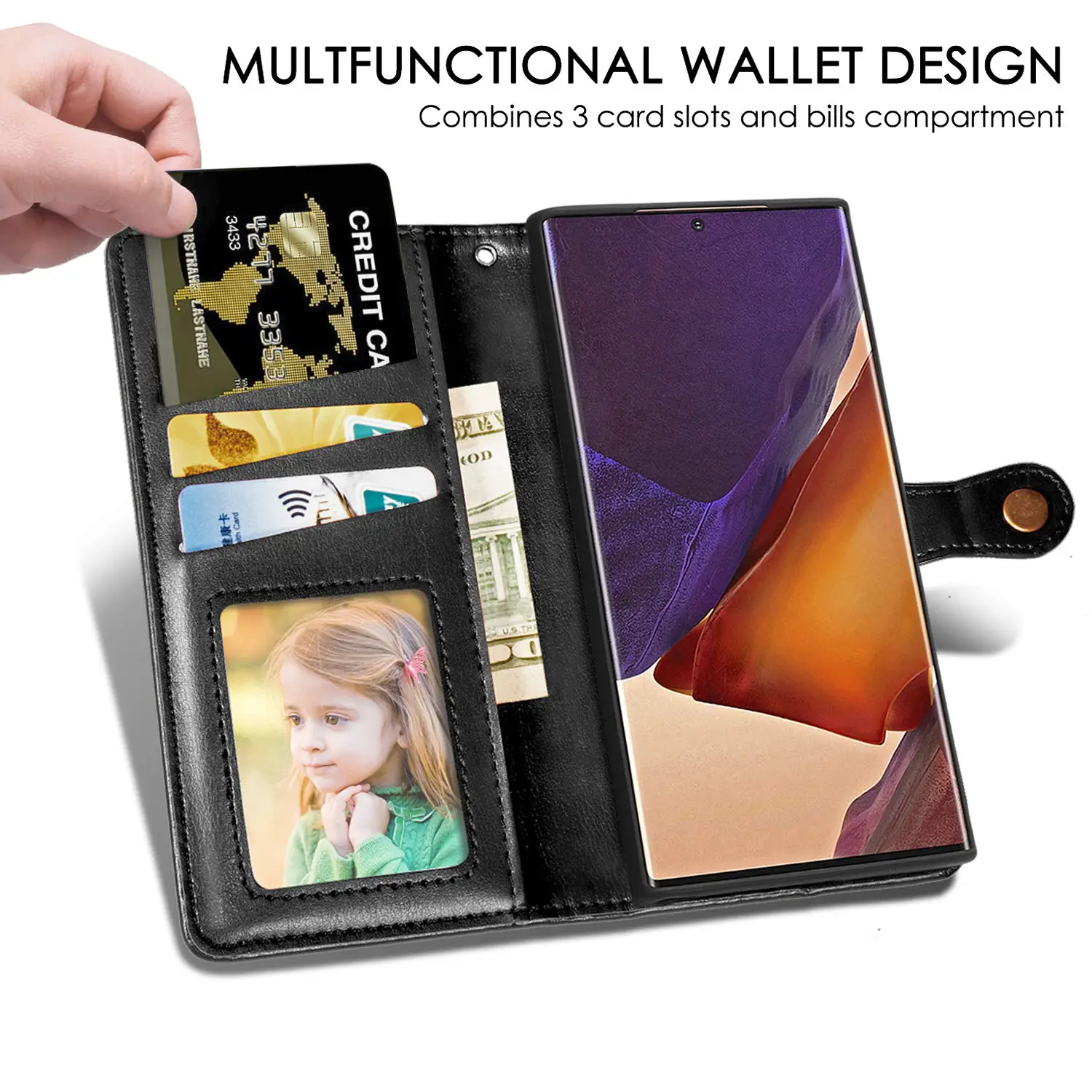 1. Особенности: Роскошный держатель для карт, защитный чехол для телефона с подставкой, 3 слота для удостоверения личности, пара кредитных карт или несколько наличных денег, без использования кошелька на открытом воздухе.