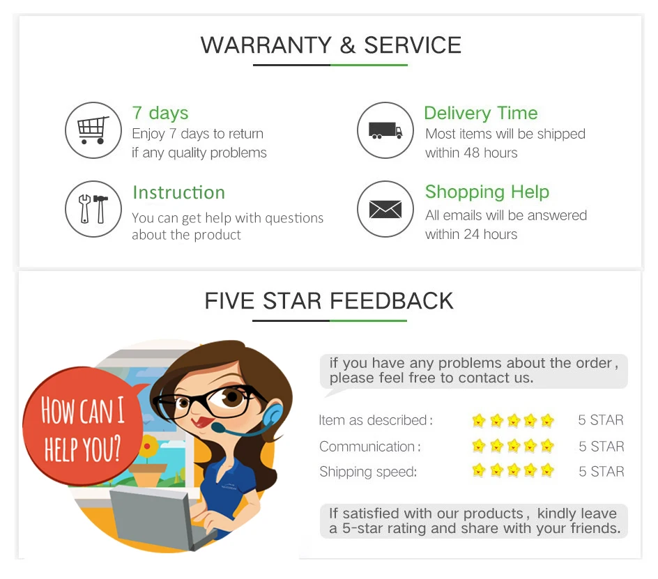 2. Пожалуйста, свяжитесь с нами, прежде чем сделать 3 звезды или 1-2 звезды отзывы. Мы приложим все усилия, чтобы решить проблемы и оставить вам счастливое настроение покупок здесь. Спасибо.