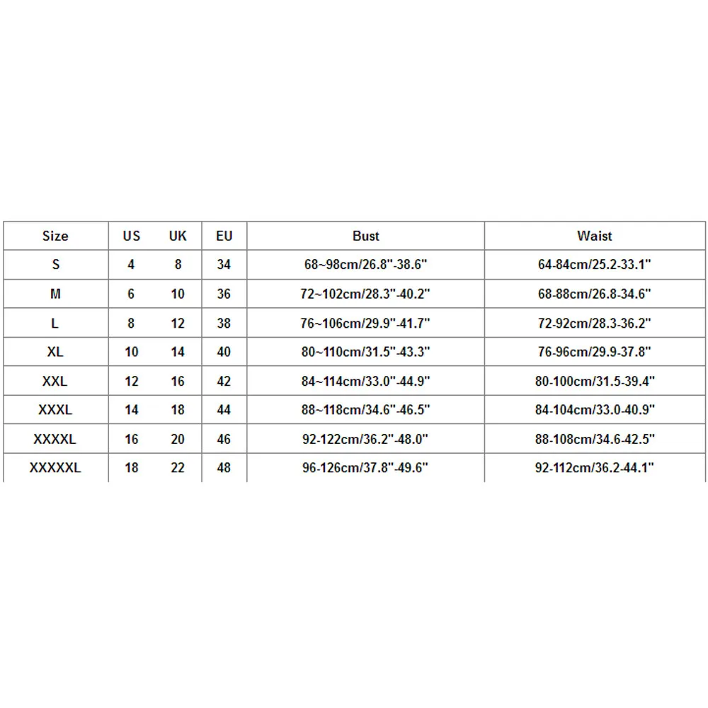 Размеры США Великобритания ЕС Бюст Талия S 4. 8 34 68 ~ 98 см/26,8 "-38,6" 64-84 см/25,2-33,1" М 6 10 36 72 ~ 102 см/28,3 "-40,2" 68-88 см/26,8-34,6" L 8 12 38 76 ~ 106 см/29,9 "-41,7" 72-92 см/28,3-36,2" XL 10 14 40 80 ~ 110 см/31,5 "-43,3" 76-96 см/29,9-37,8" XXL 12 16 42 84 ~ 114 см/33,0 "-44,9" 80-100 см/31,5-39,4" XХХL 14 18 44 88 ~ 118 см/34,6 "-46,5" 84-104 см/33,0-40,9" XXXXL 16 20 46 92-122 см/36,2 "-48,0" 88-108 см/34,6-42,5" XXXXXL 18 22 48 96-126 см/37,8 "-49,6" 92-112 см/36,2-44,1"