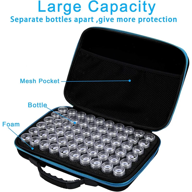 Прочный и ударопрочный-чехол для хранения сверл изготовлен из прочного материала EVA, который является водонепроницаемым и прочным. Внутри есть разделитель пены с 60 прорезями, который защитит банки от трения или удара. Пластиковая жесткая ручка позволяет легко переносить чехол. Хорошая вместительная зона для хранения лакомств на внутренней стороне крышки и идеально подходит для ваших инструментов, если вы Алмазный художник.