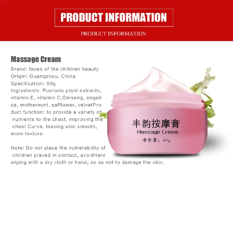 -Используйте горячие полотенца для груди до нагревания, прежде чем использовать продукт, а затем равномерно принимайте подходящий крем для красоты с обеих сторон груди, мягко массируйте до полного впитывания. Продукты для улучшения груди должны следовать курсу лечения, с одной или двумя бутылками/коробкой, отсутствие эффективности.