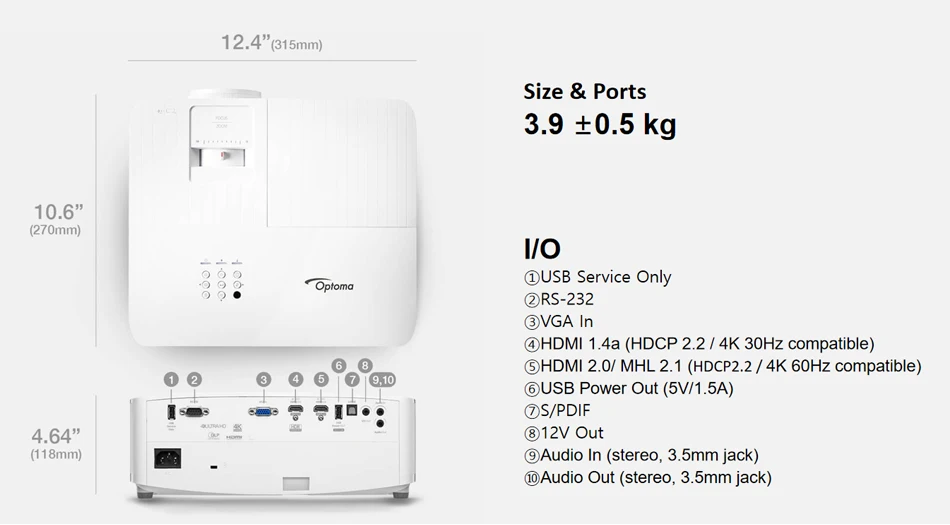 Размеры & Порты: 3,9 ± 0,5 кгI/O1. Только обслуживание USB2. RS-2323. VGA In4. HDMI1.4a (HDCP 2,2/4K 30Hz совместимый)5.HDMI2.0 /MHL 2,1 (HDCP 2,2/4K 60Hz совместимый)6. Выход питания USB (5 В/1,5a)7. S/PDIF8. 12 В выход9. Аудио вход (стерео, 3,5 мм джек)10. Аудио выход (стерео, 3,5 мм Джек)