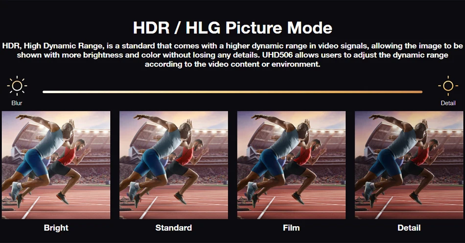 Режим Pitcure HDR/HLGHDR, высокий динамический диапазон, является стандартом, который поставляется с более высоким динамическим диапазоном в видеосигналах, позволяя изображению показываться с большей яркостью и цветом, не теряя никаких деталей, UHD506 позволяет пользователям регулировать динамический диапазон в соответствии с видео-контентом или окружающей средой.