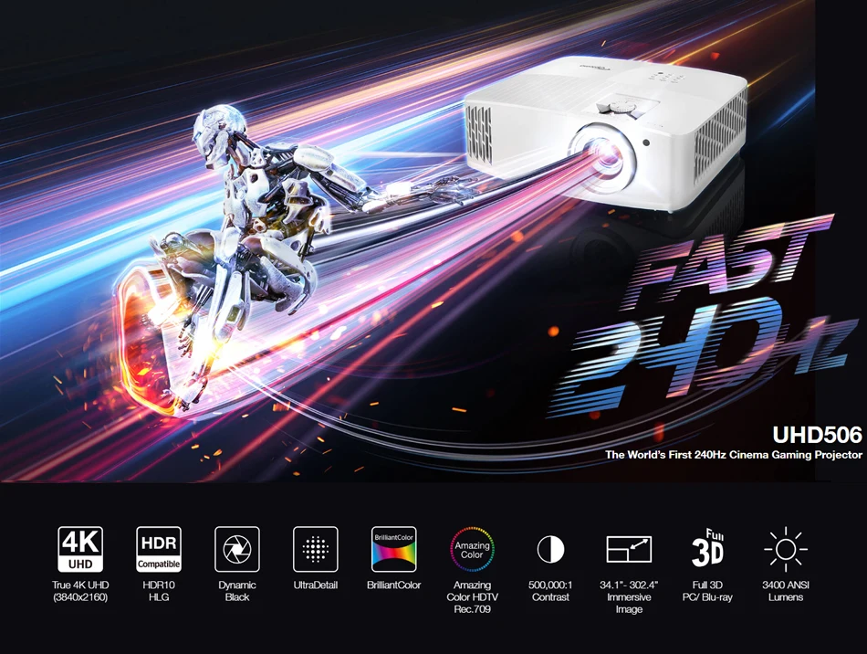 ① True 4K UHDOptoma UHD506 настоящий 4K UHD проектор питается от революционный Texas Instruments в формате 4K UHD, DLP Chihpset благодаря высокой эффективности точильные камни DMD с использованием XPR обработки видео Технология с быстрое переключение на дисплей 8,3 миллион пикселей (4x количество пикселей 1080P) В соответствии со спецификацией 4K UHD ассоциации потребительских технологий.