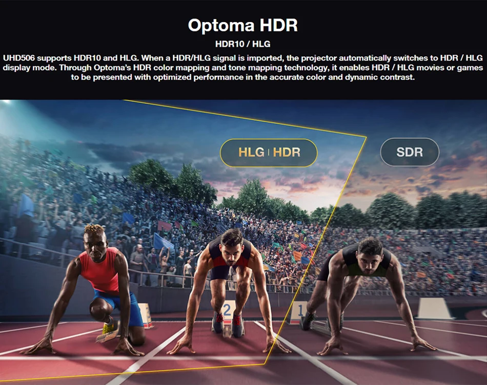 ① HDRUHD506 поддерживает HDR10 и HLG. При импорте сигнала HDR/HLG проектор автоматически переключается в режим отображения HDR/HLG. Благодаря технологии цветового сопоставления HDR и тонального сопоставления, HDR/HLG фильмы или игры будут представлены с оптимизированной производительностью в точной цветовой и динамической контрастности.