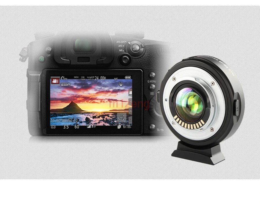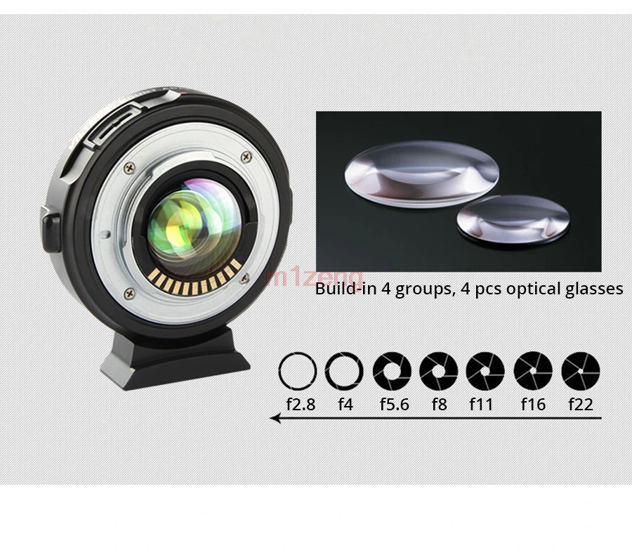 EF-M2 Встроенный адаптер с оптической коррекционной группой, при использовании адаптера фокус объектива должен быть умножен на 0,71, затем умножен на 1,5 (мультипликатор фокуса), это эквивалент фокуса lens.