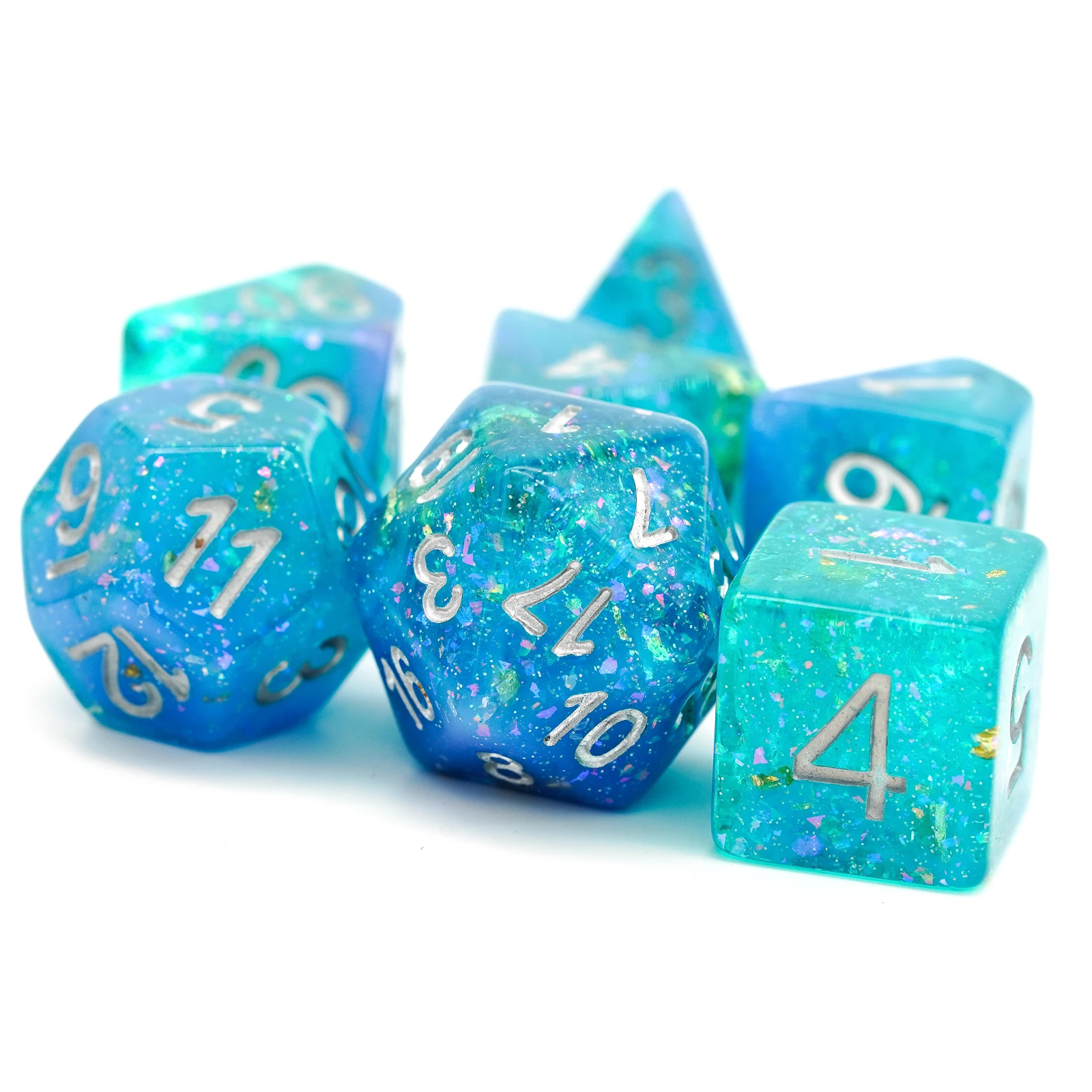 Это полный набор игральных костей, включающий 1 * D4, 1 * D6, 1 * D8, 1 * D10(0-9), 1 * D12, 1 * D20 и 1 * D %(00-90).