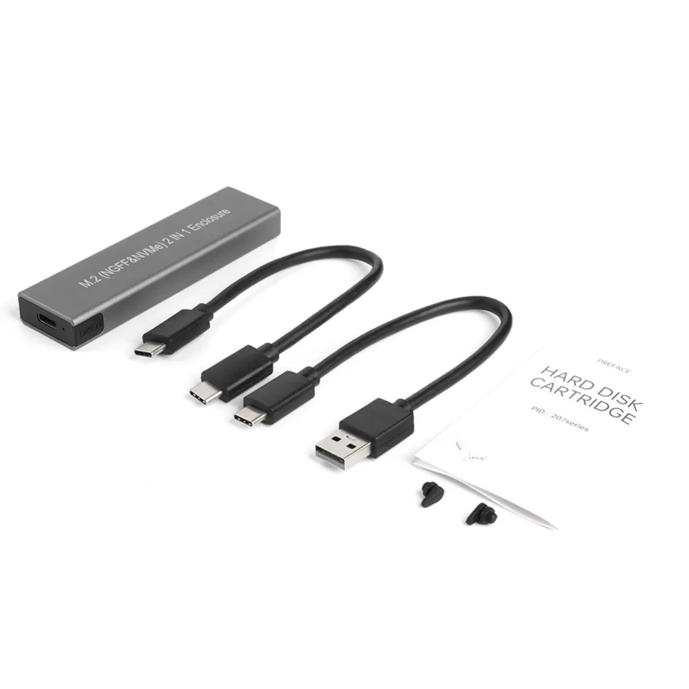 Посылка включает:1 х SSD корпусКабель USB-C-USB-A-1 шт.Кабель USB-C-1 шт.2 крепежных пряжки для жесткого диска1 х МануаL