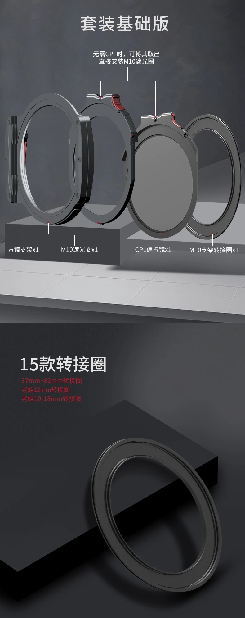 Комплект состоит из трех основных компонентов, держателя фильтра M10, кольца адаптера держателя фильтра и кругового поляризатора. Держатель фильтра из алюминиевого сплава предварительно установлен с двумя парами пластиковых фильтров, конфигурация, которая Вмещает два прямоугольных фильтра. Использование держателя фильтра может быть легко выполнено путем первой завинчивания входящего в комплект держателя фильтра переходное кольцо на объектив с переходным кольцом переднего фильтра. Отдельно Доступные переходные кольца позволяют использовать держатель фильтра с объективами, которые имеют 49 мм, 52 мм, 55 мм, 58 мм, 62 мм, 67 мм, 72 мм, И 82 мм передние фильтры. После установки на переходное кольцо, рычаг фиксации держателя фильтра позволяет обеспечить надежное, но регулируемое соединение, которое позволяет вращать держатель на 360 °, дальнейшее использование градуированной нейтральной плотности и других фильтров, которые усиливаются путем различного позиционирования. Чтобы предотвратить заброс светильник, который может иметь нежелательные эффекты на воздействие, от попадания между установленным фильтром и Соединенным объективом, две прокладки включены вдоль передней части держателя фильтра M10. Эти прокладки расположены так, что вместе они образуют уплотнение между слотами держателя фильтра.