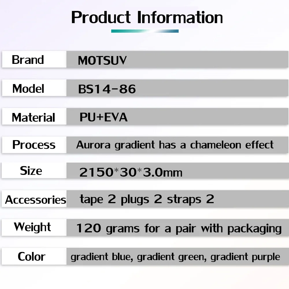 Бренд: MOTSUV Модель: BS14-86 Материал: полиуретан + Эва Процесс: градиент Авроры имеет эффект хамелеона Размер: 2150*30*3,0 мм Аксессуары: лента 2 вилки 2 ремни 2 Вес: около 120 грамм для пары с упаковкой Цвет: Хамелеон-градиентный синий, Хамелеон-градиентный зеленый, Хамелеон-градиентный фиолетовый