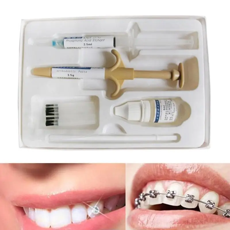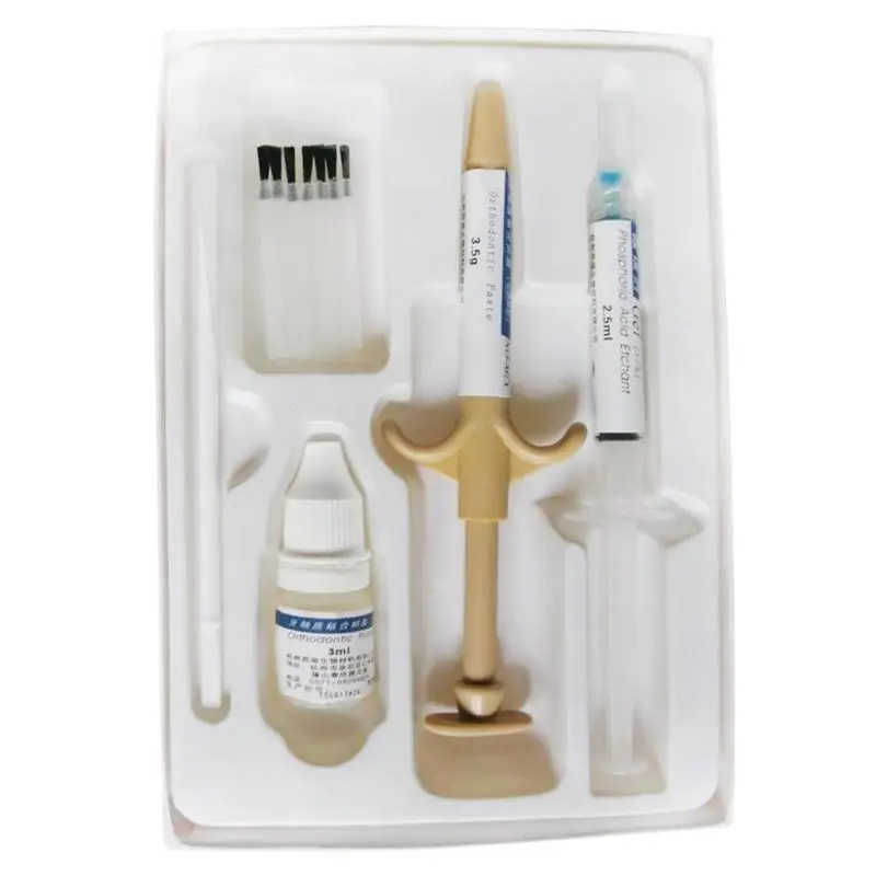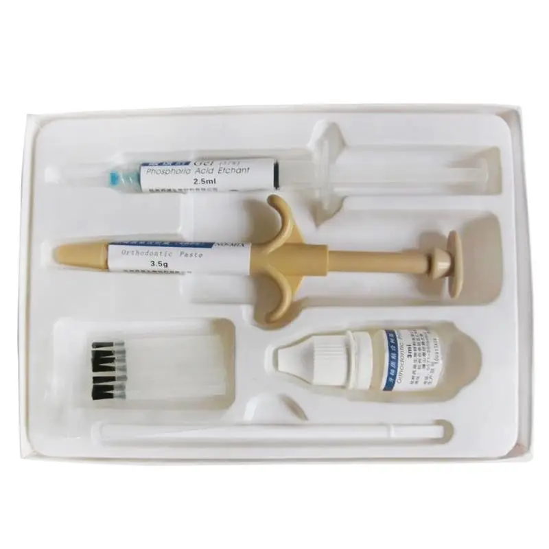 Адгезия: нанесите небольшое количество пасты гармоническим стержнем на склеивающую поверхность скобы, которая была покрыта жидкостью, и сформируйте тонкий слой. Приклейте скобы к зубам сразу после нанесения пасты. Кронштейн положения за 20 секунд, микро давление 5-10 секунд, Предотвращение скольжения кронштейнов. Через 40-60 секунд удалите лишнюю жидкость и вставьте. Через 5 минут отверждения можно выполнить Ортодонтическую операцию.