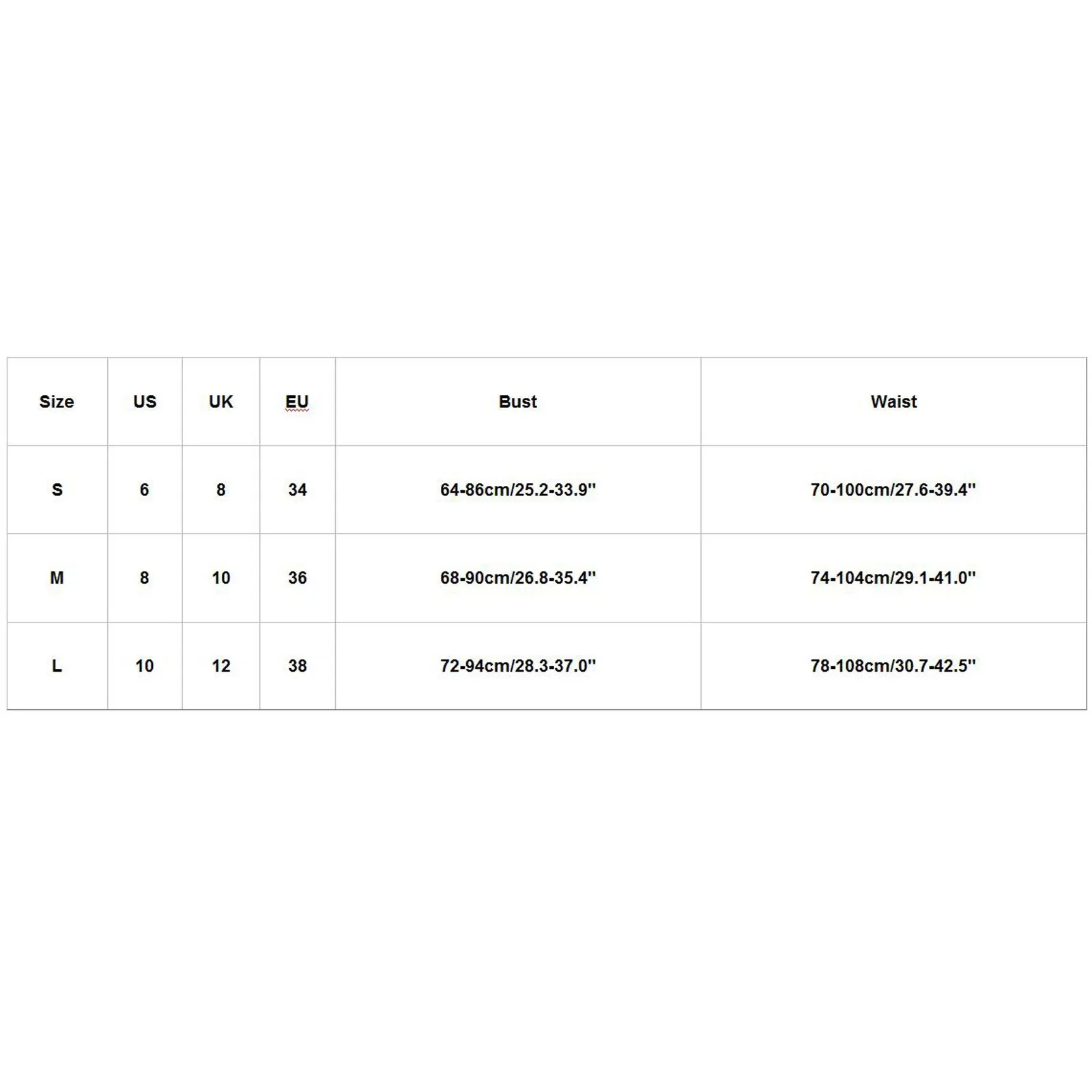 Размеры США UK ЕС Бюст Талия S 6 8 34 64-86 см/25,2-33,9 дюйма 70-100 см/27,6-39,4 дюйма М 8 10 36 68-90 см/26,8-35,4 дюйма 74-104 см/29,1-41,0 дюйма L 10 12 38 72-94 см/28,3-37,0 дюйма 78-108 см/30,7-42,5 дюйма