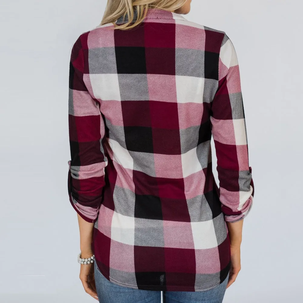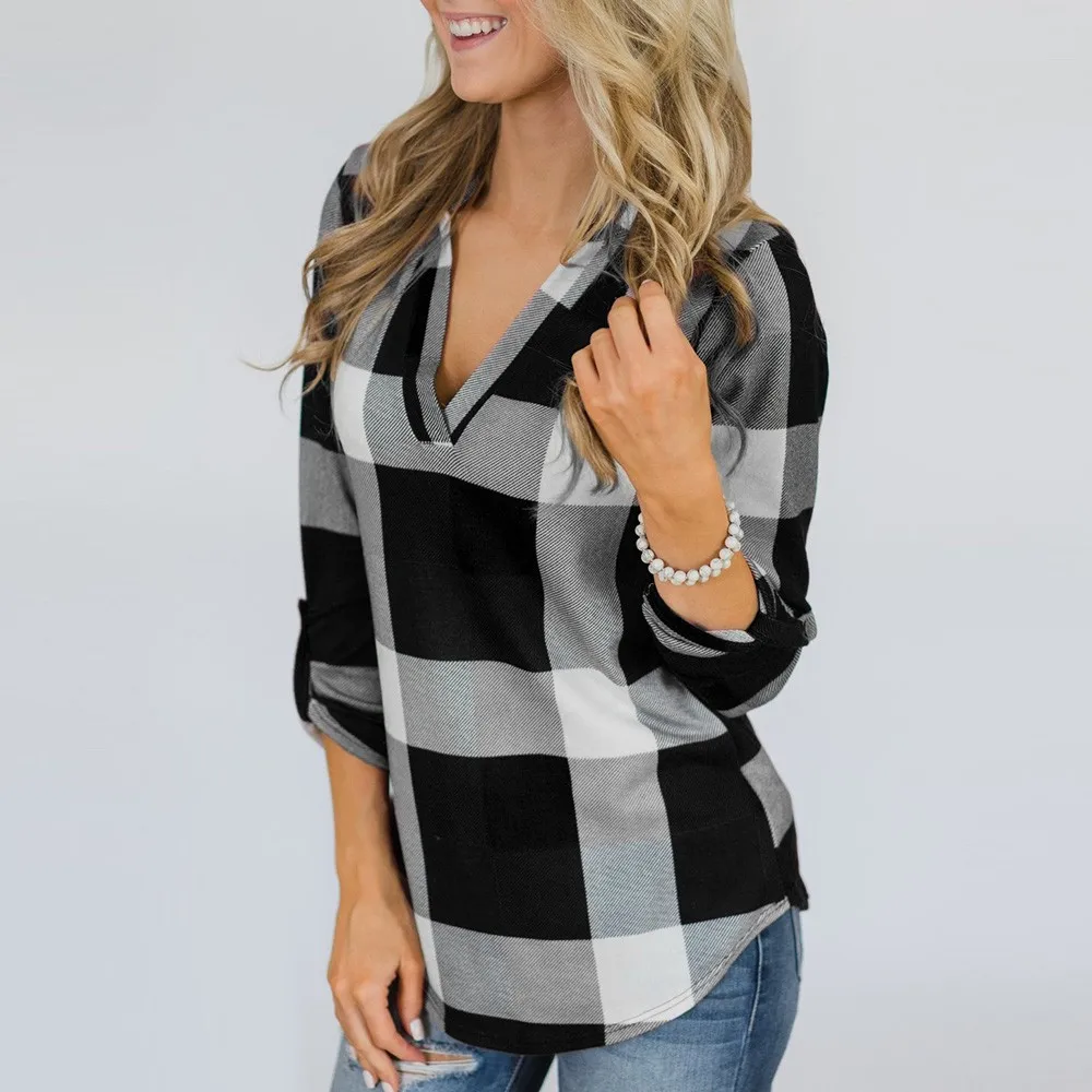 Женская рубашка в клетку с длинным рукавом и v-образным вырезом, рубашка в клетку с принтом, топы