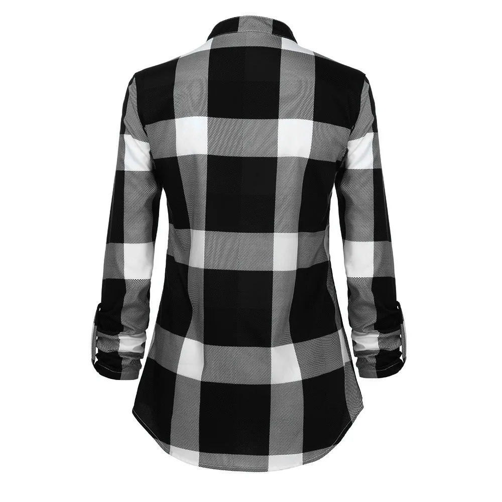 Отложной воротник, сворачивающийся длинный рукав, узор в клетку, рубашка на пуговицах, Повседневная свободная посадка, два нагрудных кармана, стиль бойфренда