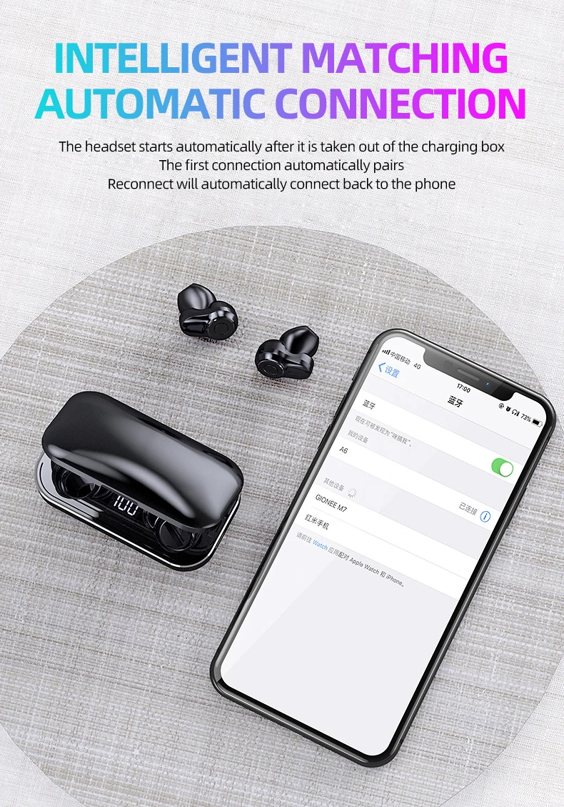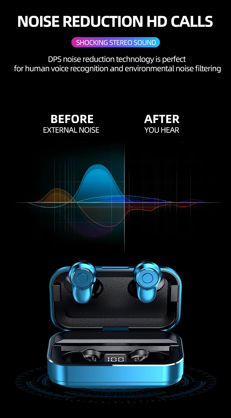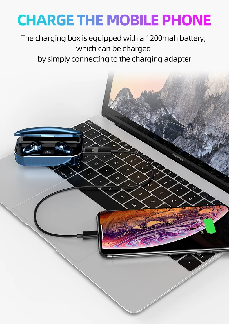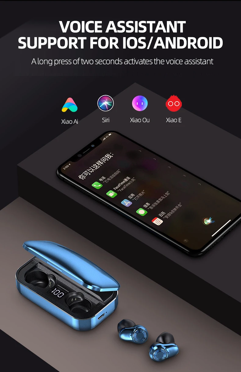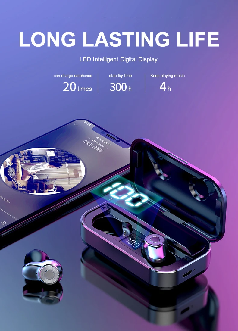 Характеристики продукта: Цвет: черный/синий/серебристый Производительность: bluetooth-гарнитуры TWS Особенности: светодиодный цифровой дисплей может заряжать мобильный телефон Применимые модели: подходит для всех мобильных телефонов и умных устройств с функцией Bluetooth Версия Bluetooth: 5,0 EDR Метод управления: сенсорный экран Эффективное расстояние: 10 м Метод бинаурального сопряжения: Автоматическое Сопряжение после загрузки Емкость аккумулятора: наушники 40 мА · ч, отсек для зарядки: 1200 мА · ч Время прослушивания музыки на наушниках: 3-5 часов (в зависимости от громкости) Время разговора на наушниках: 3-5 часов (в зависимости от громкости) Время зарядки наушников: 1 час Время зарядки: 1,5 часов Разъем для зарядки аккумулятора: micro USB Особенности: Беспроводные bluetooth-наушники обеспечивают высокое качество прослушивания звука с четкостью и плавным откликом басов для удовольствия от всех стилей музыки. Легкий и отлично подходит для занятий спортом, прогулок, бега или любимого занятия. Bluetooth 5,0, энергосбережение, улучшенная передача данных и меньше помех. Долговечная аккумуляторная батарея, до 3-5 часов воспроизведения и супер долгое время ожидания. Встроенный микрофон позволяет этим наушникам выполнять функции гарнитуры для звонков в режиме громкой связи с мобильными устройствами. Упаковочный лист: 2X Bluetooth гарнитура 1X батарейный отсек 1X USB кабель 1X руководство