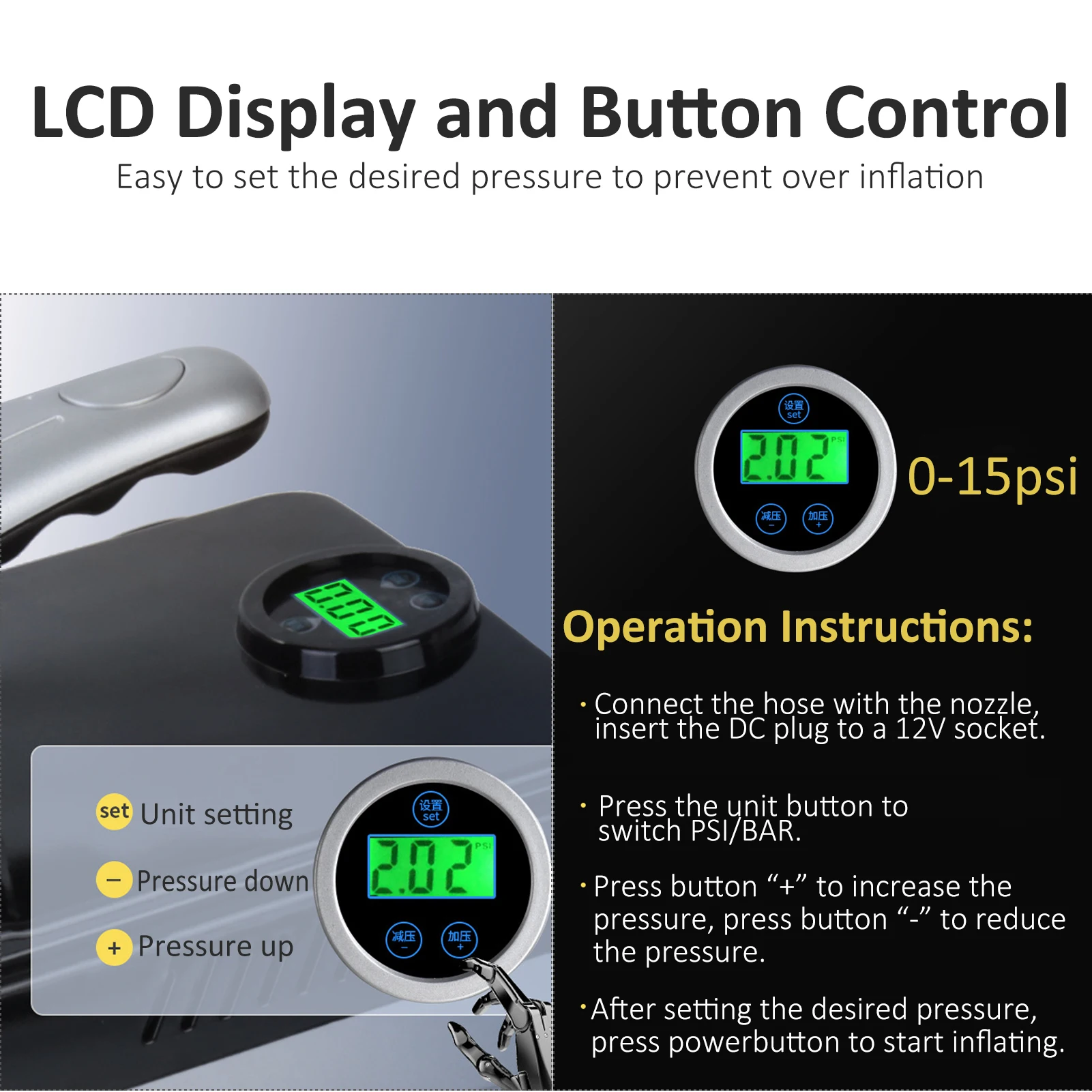 Медный мотор с высокой производительностью, • Быстро надувается от 0-20 фунтов/кв. дюйм за считанные минуты с лёгкое переключение между снятия показаний давления в фунтах/кв. дюймах и бар.