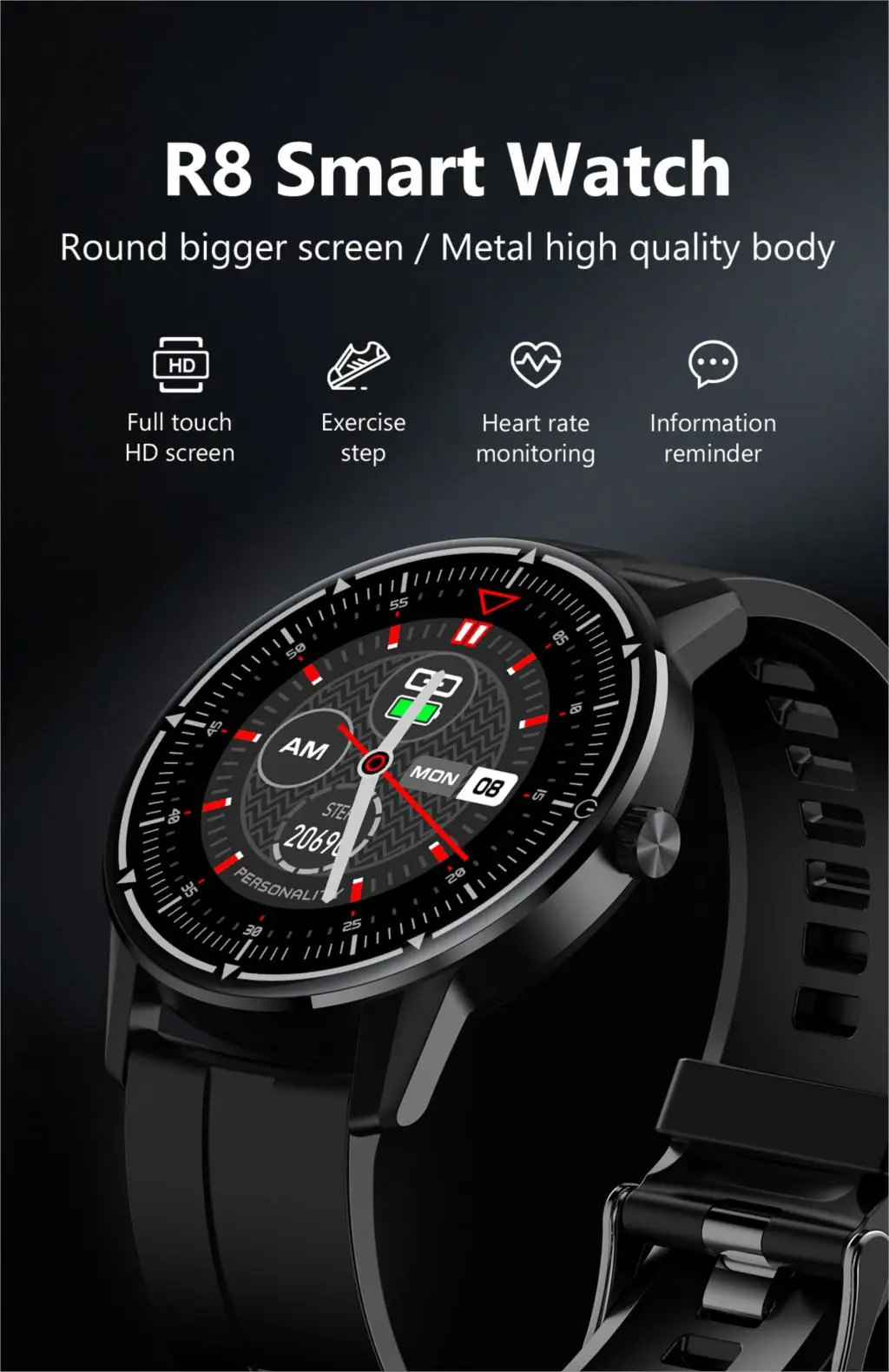 Модель: R8 Основной чип управления: HS6620D Bluetooth: BLE 4,0 Экран Размер: 1,3 дюймов Разрешение: 240*240 Способ работы: сенсорная кнопка + функциональная кнопка Аккумулятор: 200 мАч Время работы в режиме ожидания: около 5-7 дней Время работы в режиме ожидания: около 30 дней Время зарядки: около 2 часов Водонепроницаемость: IP68 Совместимая система: Android 4,4 и выше, IOS 8,4 и выше Умное напоминание: напоминание о сидячем положении, напоминание о звонках, push-сообщение (SMS / QQ / WeChat / Skype / Facebook / Twiter / Line / WhatsApp) Языки приложения: упрощенный китайский, традиционный китайский, английский, японский, корейский, французский, немецкий, русский, польский, испанский, португальский, голландский, арабский Функция: пульс/кровяное давление/Кислород/мониторинг сна, подсчет шагов, расстояние, калории, мультиспортивный режим, напоминание о звонках, SMS напоминание, напоминание о социальных сетях, напоминание о малоподвижности, будильник, встряхните фото, найдите свой мобильный телефон/браслет, секундомер, Поднимите запястье и яркий экран, переключитесь между несколькими циферблатами, не беспокойте переключатель и т. д. Примечание: Носимые устройства отслеживают деятельность человека с помощью электронных датчиков, и они находятся на уровне электуоники потребителя. Это нормально для определенного отклонения. Пользователь должен рассматривать данные объективно. -Пожалуйста, не сравнивайте с больничным оборудованием для чтения, это не медицинское устройство! -- Перед использованием отсканируйте qr-код в руководстве, чтобы загрузить приложение и подключить его к часам с помощью приложения. -Для пользователя Android: пожалуйста, всегда разрешайте доступ приложения ко всем функциям телефона и Всегда позволяйте ему работать. И, пожалуйста, включите GPS на вашем телефоне, прежде чем подключить его. -Пожалуйста, заряжайте его в течение 2-3 часов после получения. После длительной доставки у него не было электричества. Спасибо!