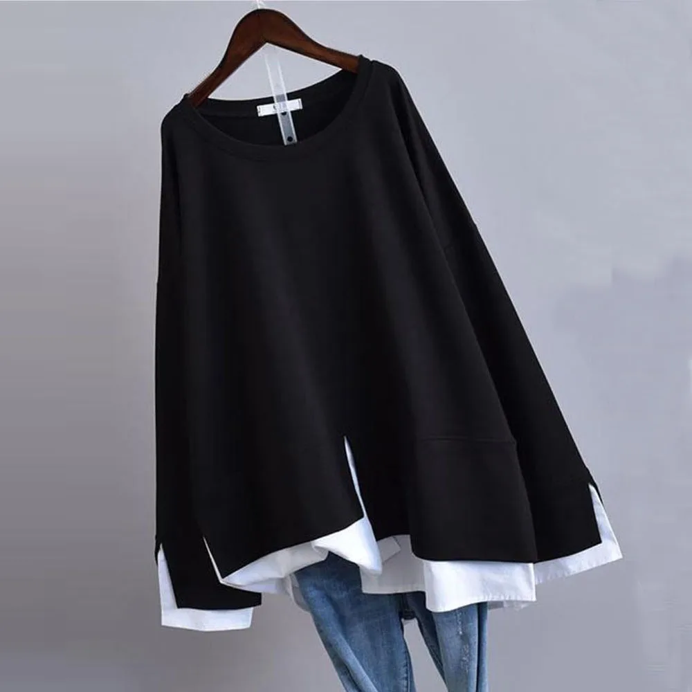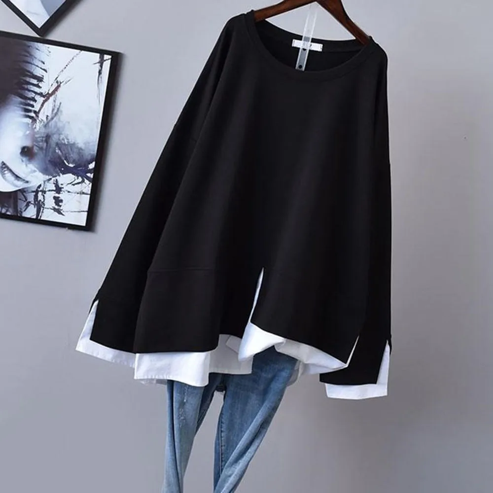 Осенний жилет, сшитая рубашка, имитация двух частей, темперамент, корейский стиль, для женщин, 2020, Новый Свободный Повседневный пуловер, женские модные топы с круглым вырезом