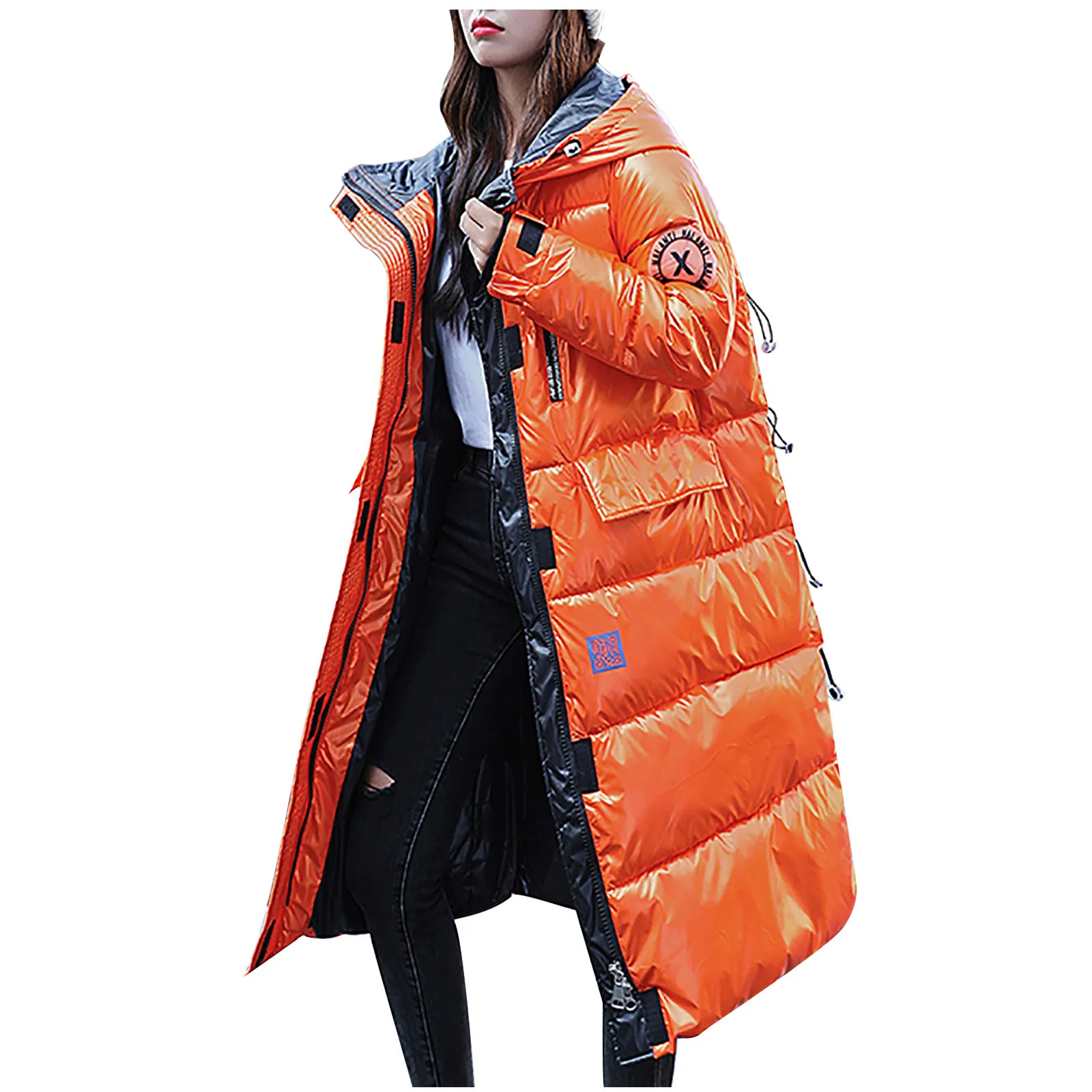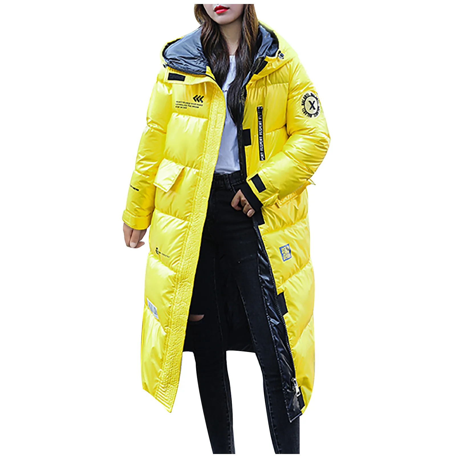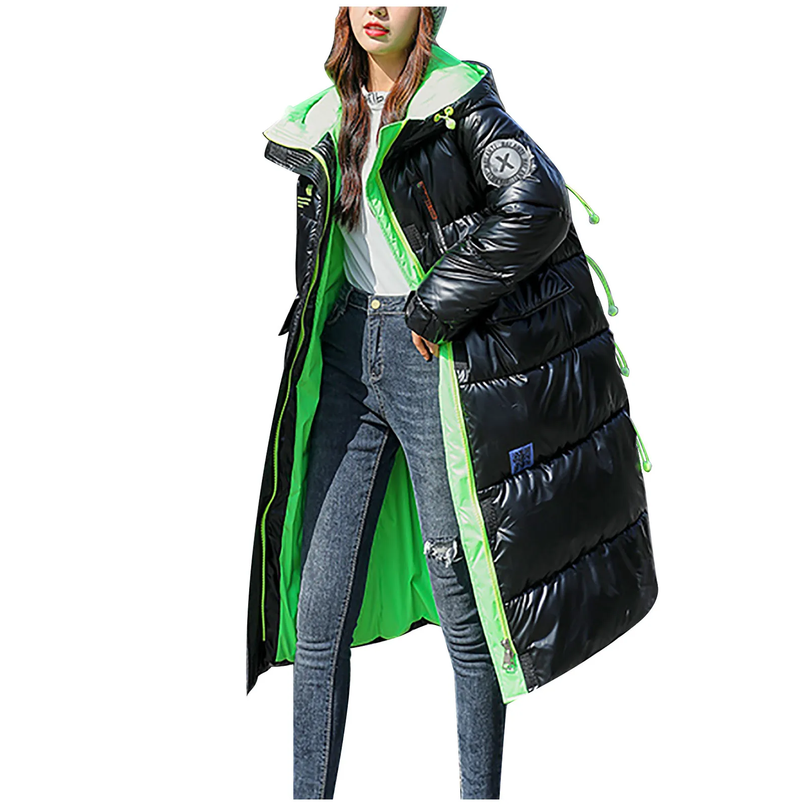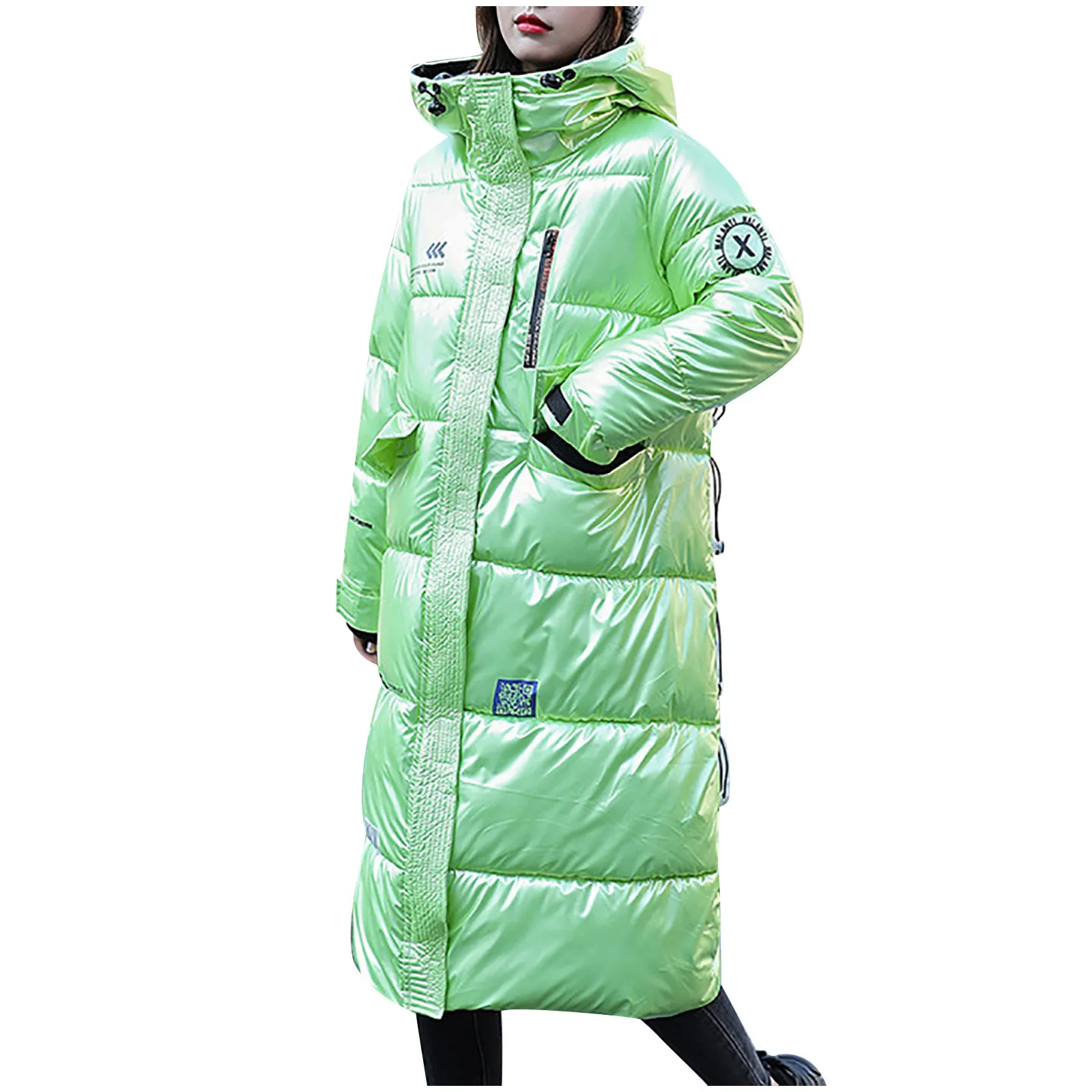 Женская зимняя модная блестящая длинная толстая стеганая куртка выше колена с капюшоном