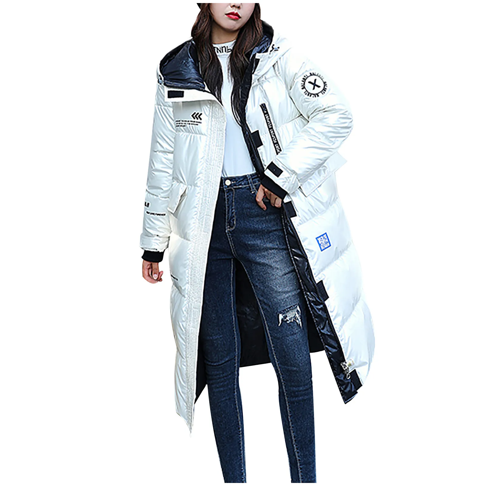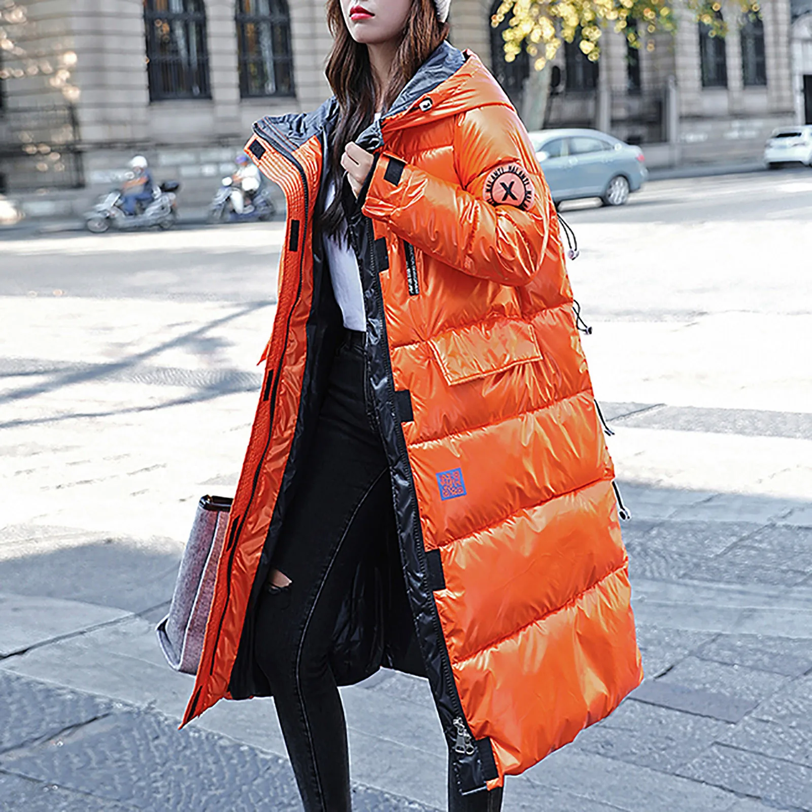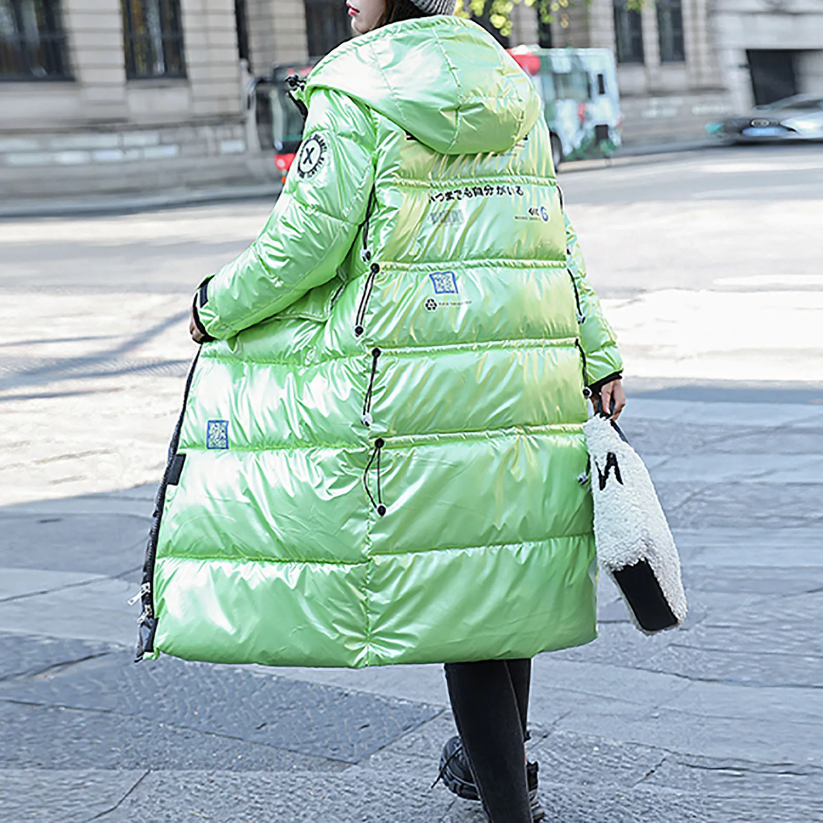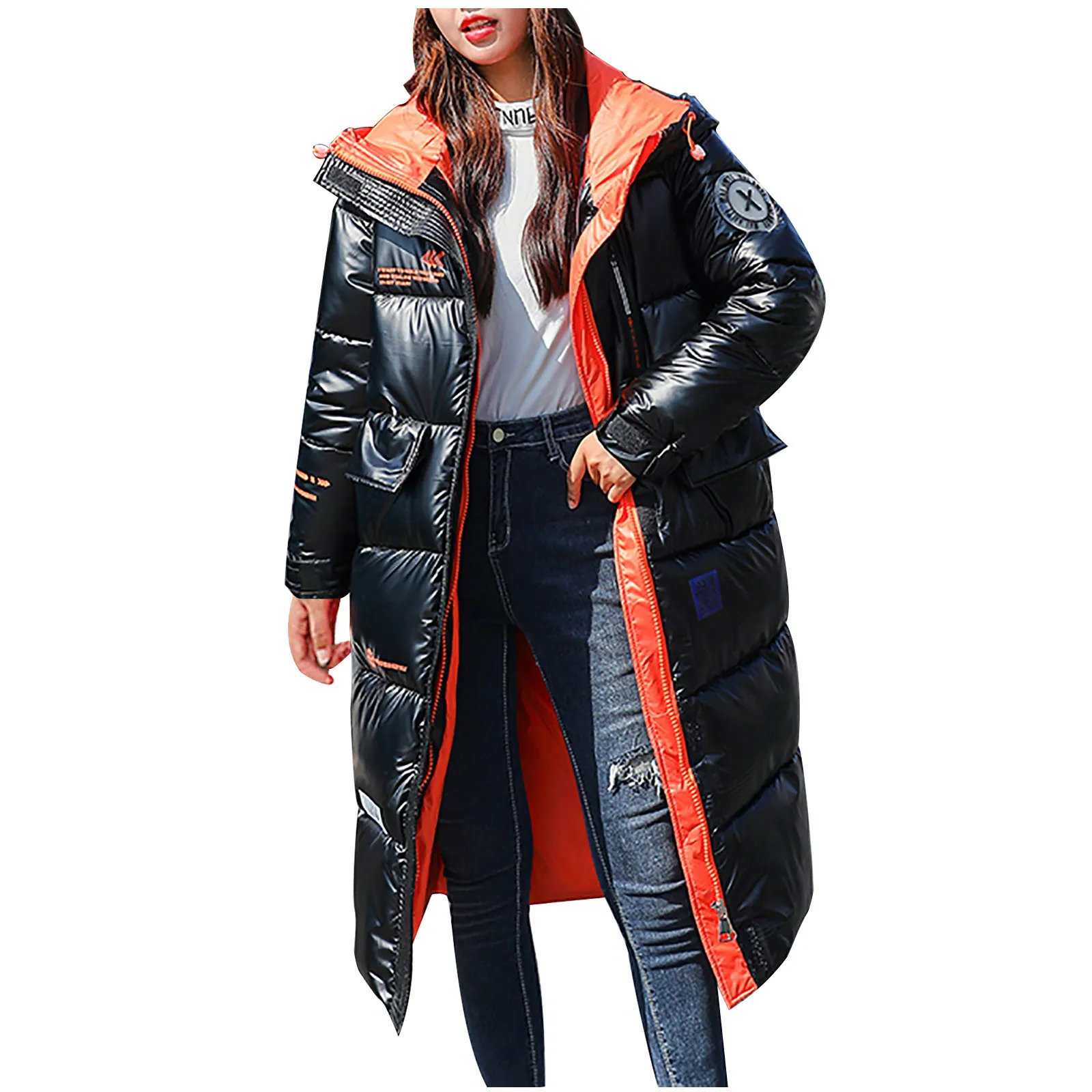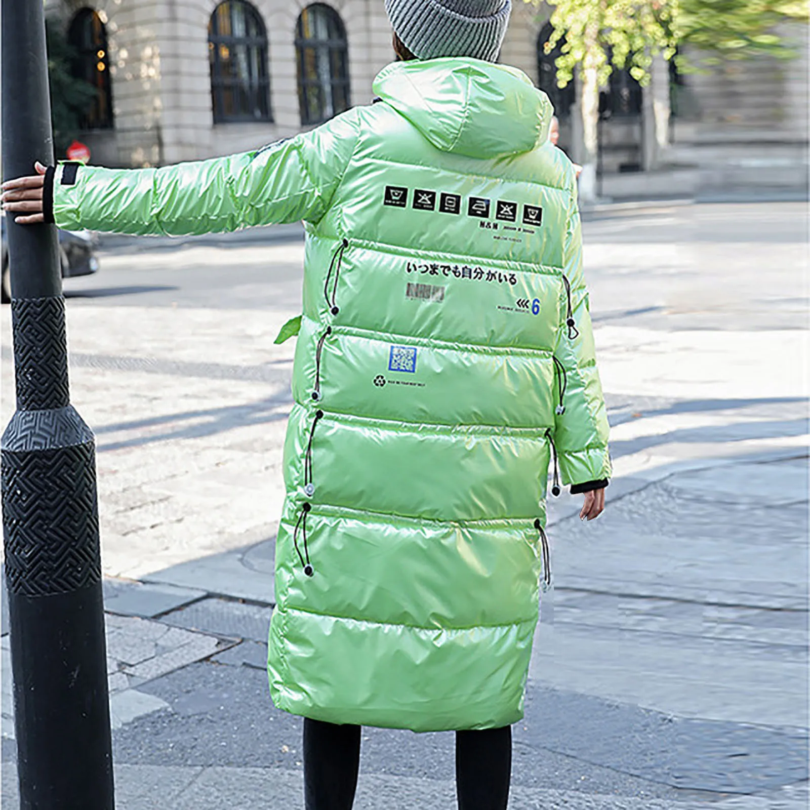 Женская зимняя модная блестящая длинная толстая стеганая куртка выше колена с капюшоном