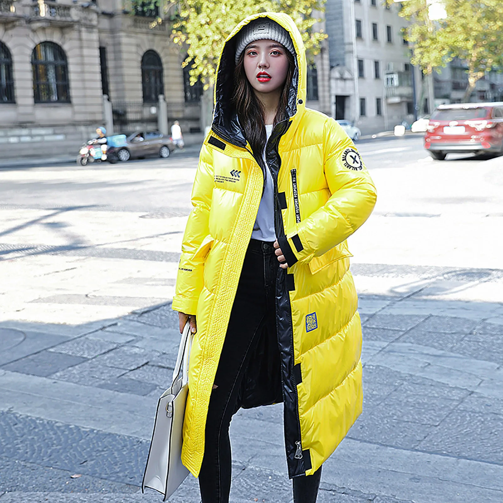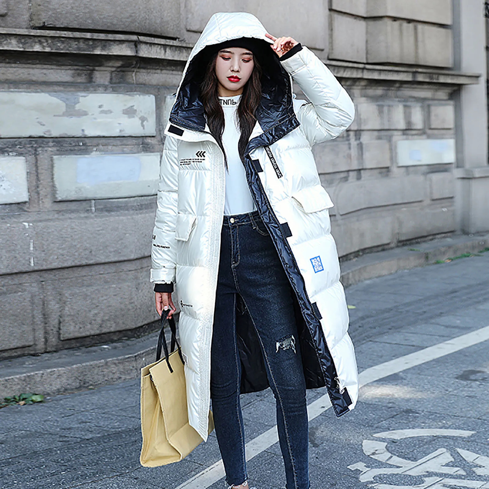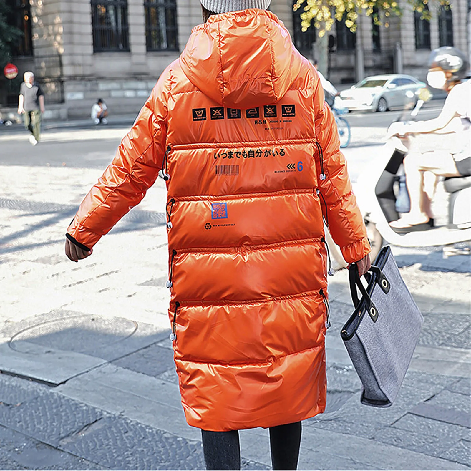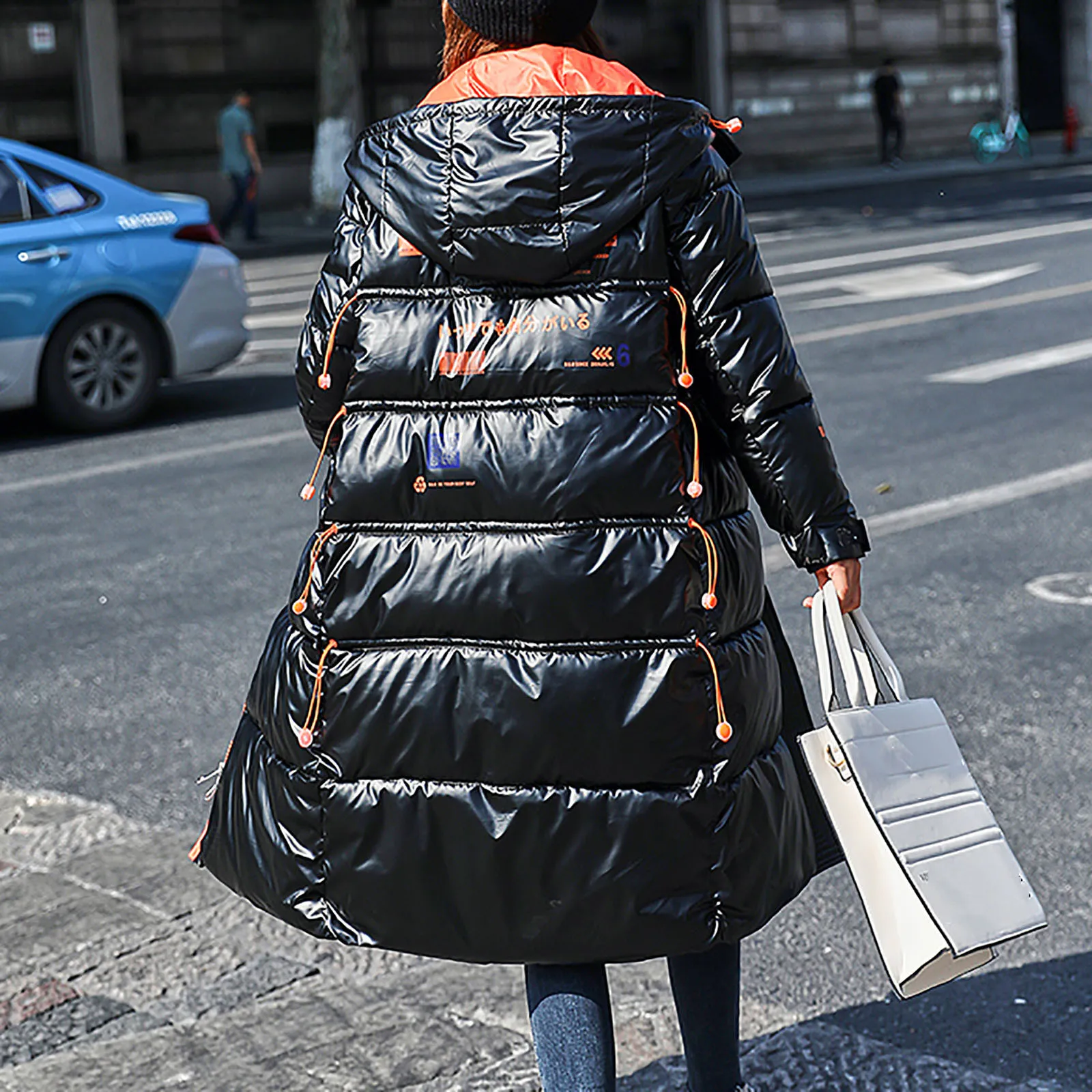 Женская зимняя модная блестящая длинная толстая стеганая куртка выше колена с капюшоном