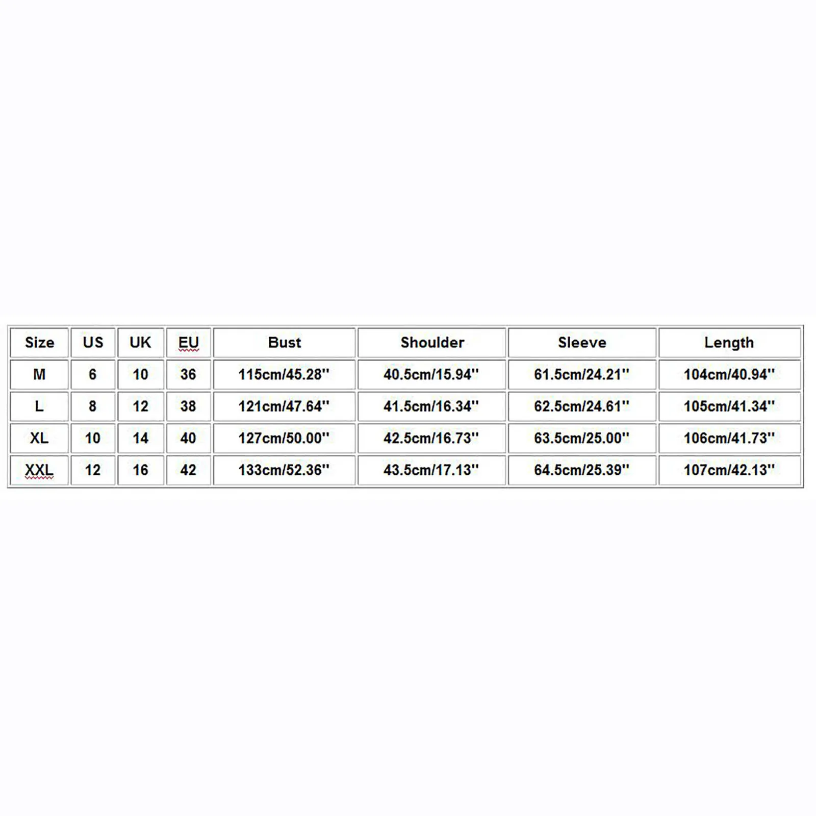 Размер США Великобритания ЕС Бюст Плечо Рукав Длина М 6 10 36 115 см/45,28'' 40,5 см/15,94'' 61,5 см/24,21'' 104 см/40,94'' L 8 12 38 121 см/47,64'' 41,5 см/16,34'' 62,5 см/24,61'' 105 см/41,34'' XL 10 14 40 127 см/50,00'' 42,5 см/16,73'' 63,5 см/25,00'' 106 см/41,73'' XXL 12 16 42 133 см/52,36'' 43,5 см/17,13'' 64,5 см/25,39'' 107 см/42,13''