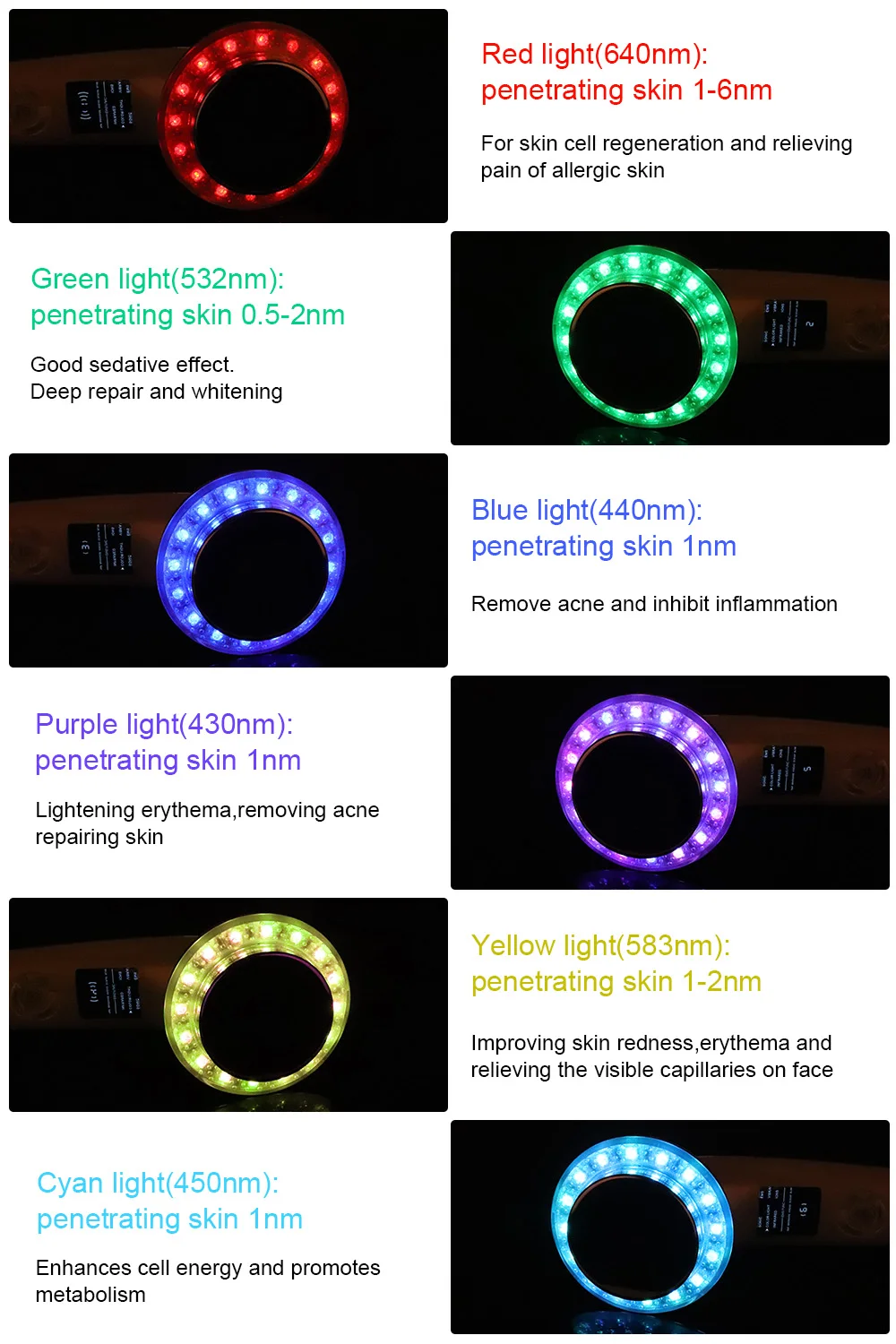 1. Красный светильник (640нм): проникающая кожа 1-6nm.для регенерации клеток кожи и снятия боли в аллергической коже