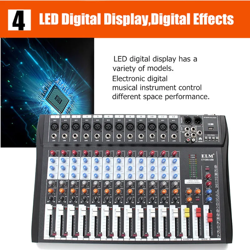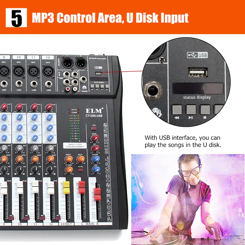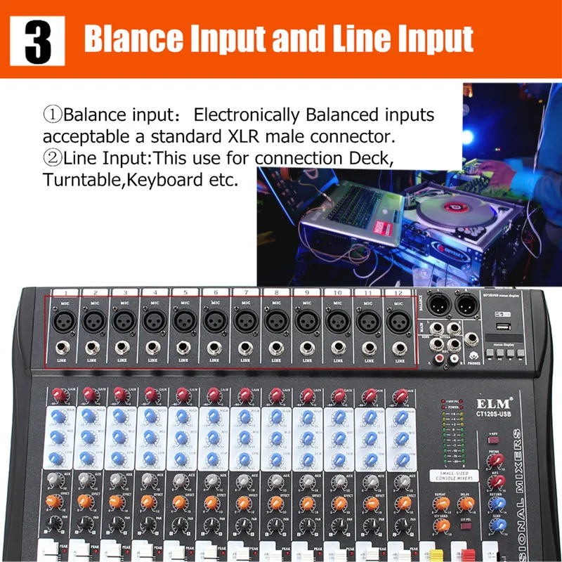-Каждый канал имеет коэффициент усиления, 3-полосный/AUX кабель/USB кабель, эффект, PAN ручки управления и регулятор громкости фейдера.