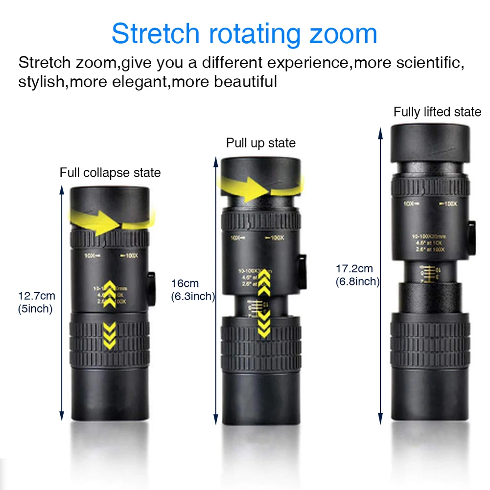 С 10-300x40 высоким увеличением, увеличение обновляется с 10 раз до 300 раз, что может обеспечить более широкую, более четкую и яркую сцену в ваших глазах. Отрегулируйте увеличение этого монокулярного зум-объектива в соответствии с вашими потребностями, и он предоставит вам визуальную точность, чтобы смотреть на чудесный мир.