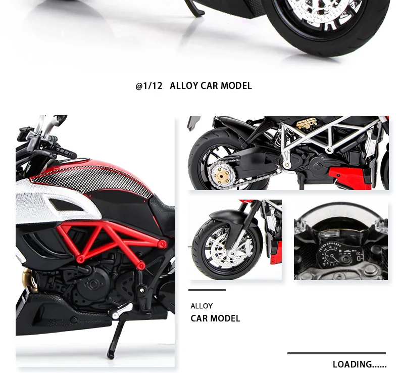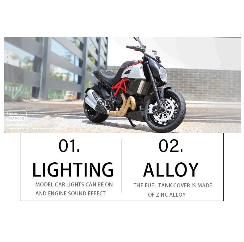 Название: Ducati Diavel Бренд: HuaYi Размеры: около 18cmX6cmX10cm Масштаб: 1:12 Материал: литой металл с пластиковыми деталями Цвет: красный/черный Упаковка: Полноцветная оконная коробка Функция: ● Переднее колесо и руль могут качаться из стороны в сторону ● Звук и светильник ● Подвижная подставка ● Пружинная задняя подвеска ● Колеса свободной прокатки