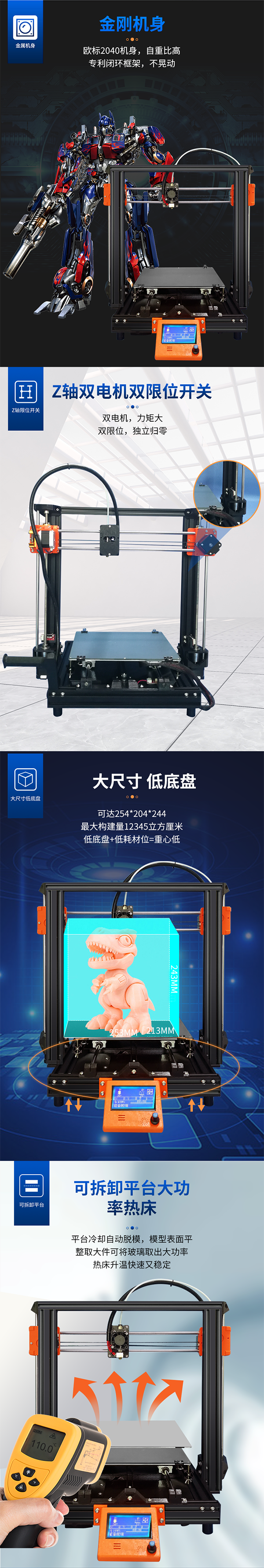 Размер печати: 254x204x244 мм Скорость печати: 20-100 мм/сек. Диапазон слоев: 0,05-0,4 Максимальная температура сопла: 245 градусов Максимальная температура подогреваемой кровати: 85 градусов Нить: PETG, PLA, CARBON, ASA, ABS, HIPS, WOOD, PC, PVA Программное обеспечение: CAD, UG, PRO/E, Solidworks, 3D Max, Maya, Rhino, Blender и т. д. Формат: stl, obj, amf, gcode Входное напряжение: переменный ток 100В/240В, 50/60 Гц Выходное напряжение: DC24V/240 Вт Размер машины: 500x500x482мм Вес нетто: 7,2 кг