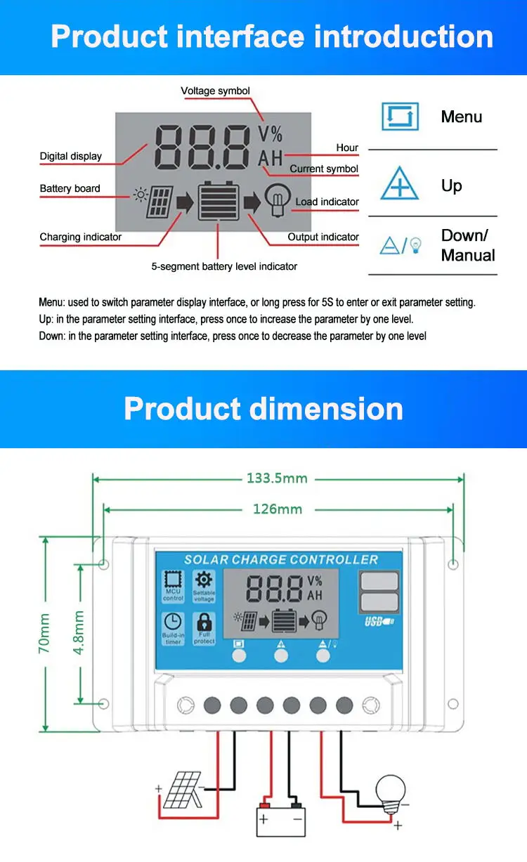 1. У нас также есть контроллер солнечной зарядки 30 А 40 А 50 А. Если вам это нужно, пожалуйста, свяжитесь с нами!