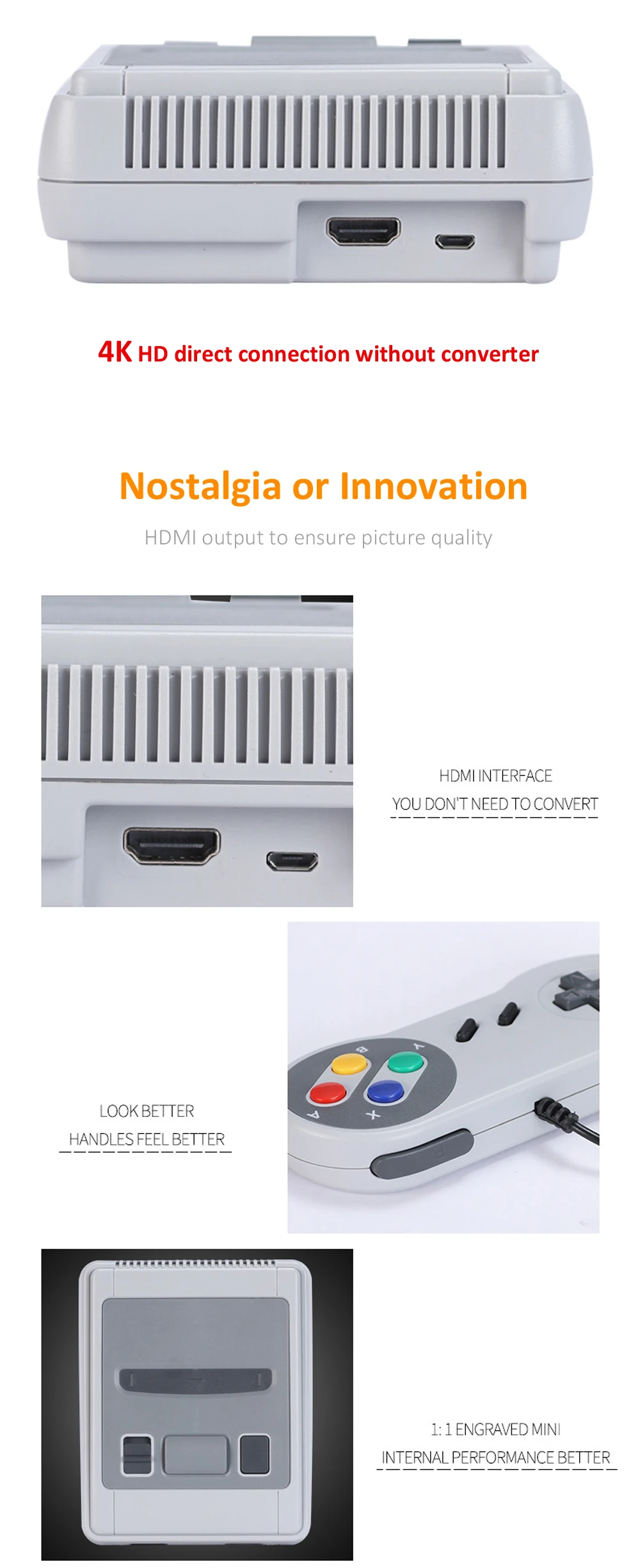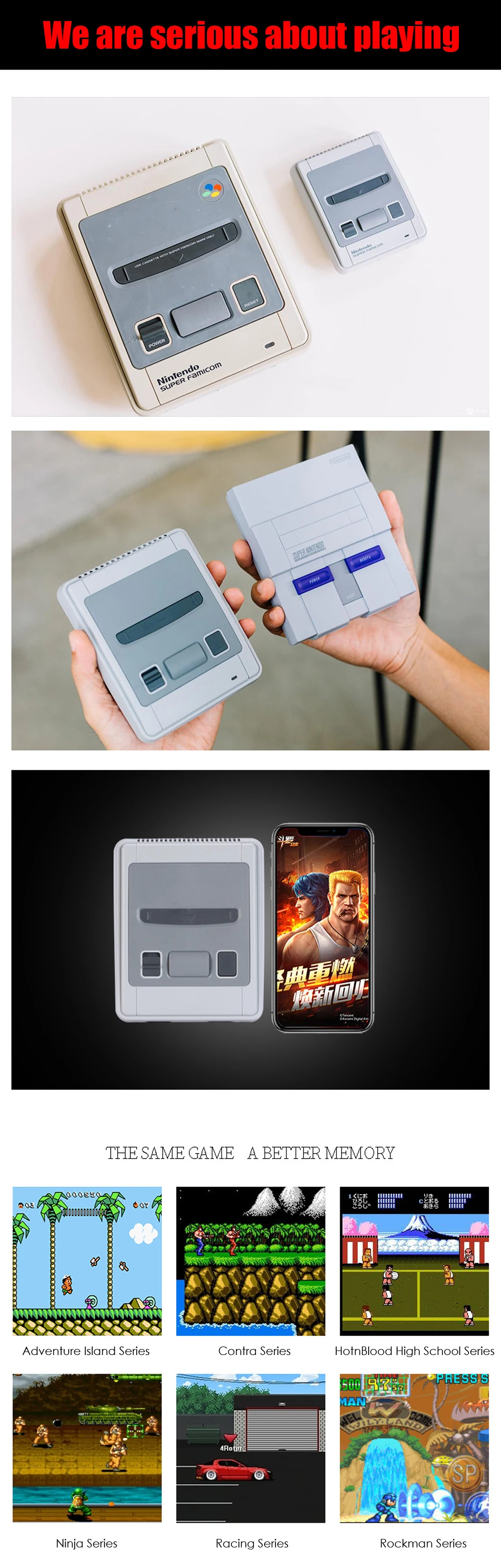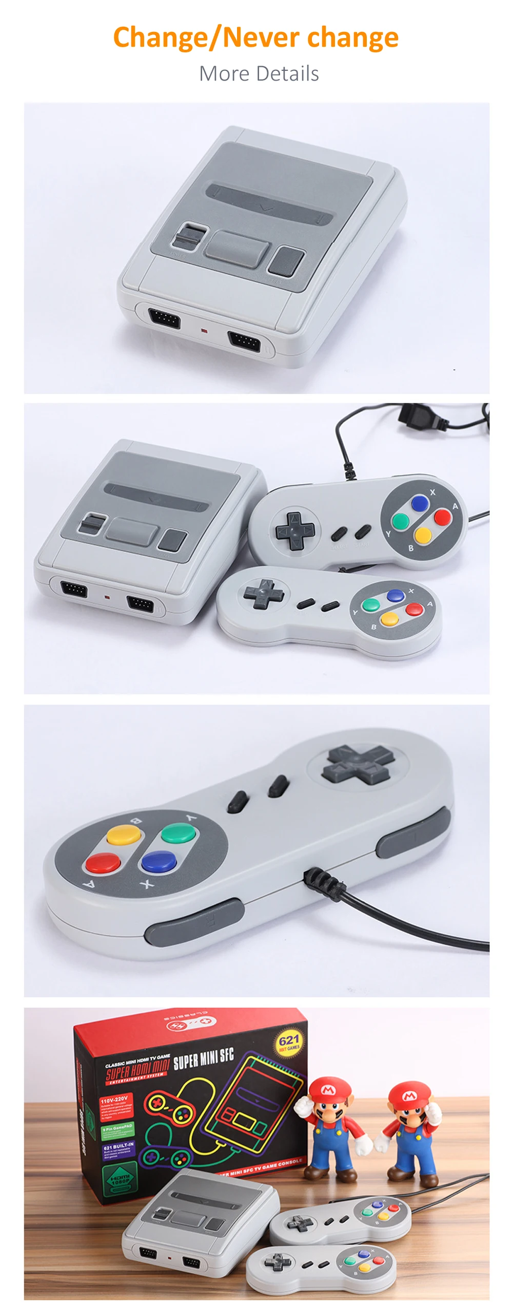 621 игры ретро мини классический HDMI-совместимый AV 8 бит видео игровая консоль Ручной игровой плеер Рождественский подарок Особенности: 1. Он построен в 621 классических играх. 2. Он будет отправлен с помощью кабеля, совместимого с HDMI. 3. Новые SFC совместимы с nasure. 4. Карта поддержки отсутствует. 5. Номер 621 повторяется. 6. Оснащен двумя контроллерами для поддержки двух игровых игр. 7. Домашняя ТВ-игровая консоль. 8. Взрослые и дети играют в игры вместе. Характеристики: Материал: АБС-пластик Входное напряжение: AC 110V ~ 240V / 50 ~ 60Hz Выходной ток: 5 В/200 мА Мощность Длина шнура: 1,5 м/4.92ft HDMI Длина кабеля: 1,5 м/4.92ft Длина ручки кабеля: 1,8 м/5.91ft Встроенные игры: 621 игры Размер: 135*110*45 мм/5,31*4,33*1,77'' Стандарт Вилки: ЕС, США