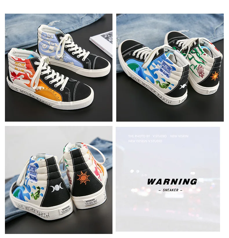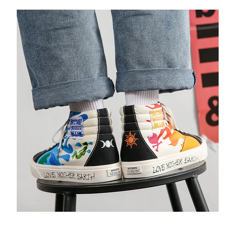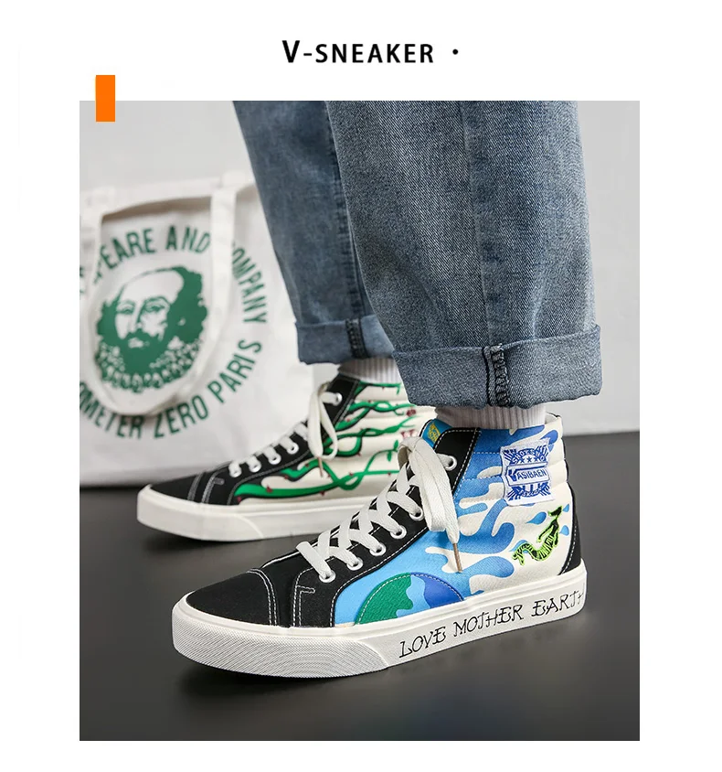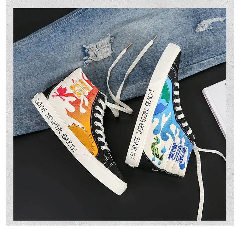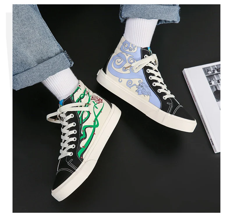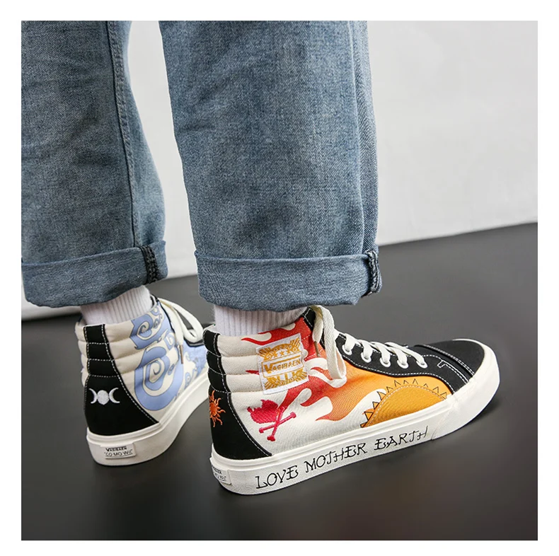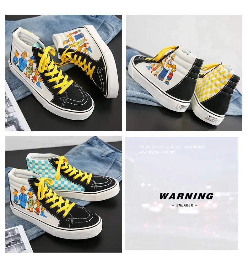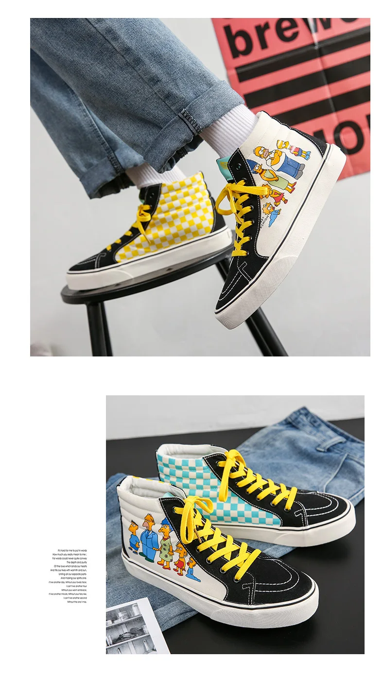 Парусиновая обувь для скейтборда; Мужские модные парусиновые кроссовки с принтом из мультфильма; Женская обувь на весну и осень; Обувь с высоким берцем и вулканизированной подошвой