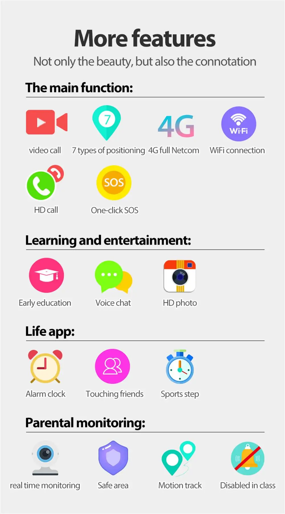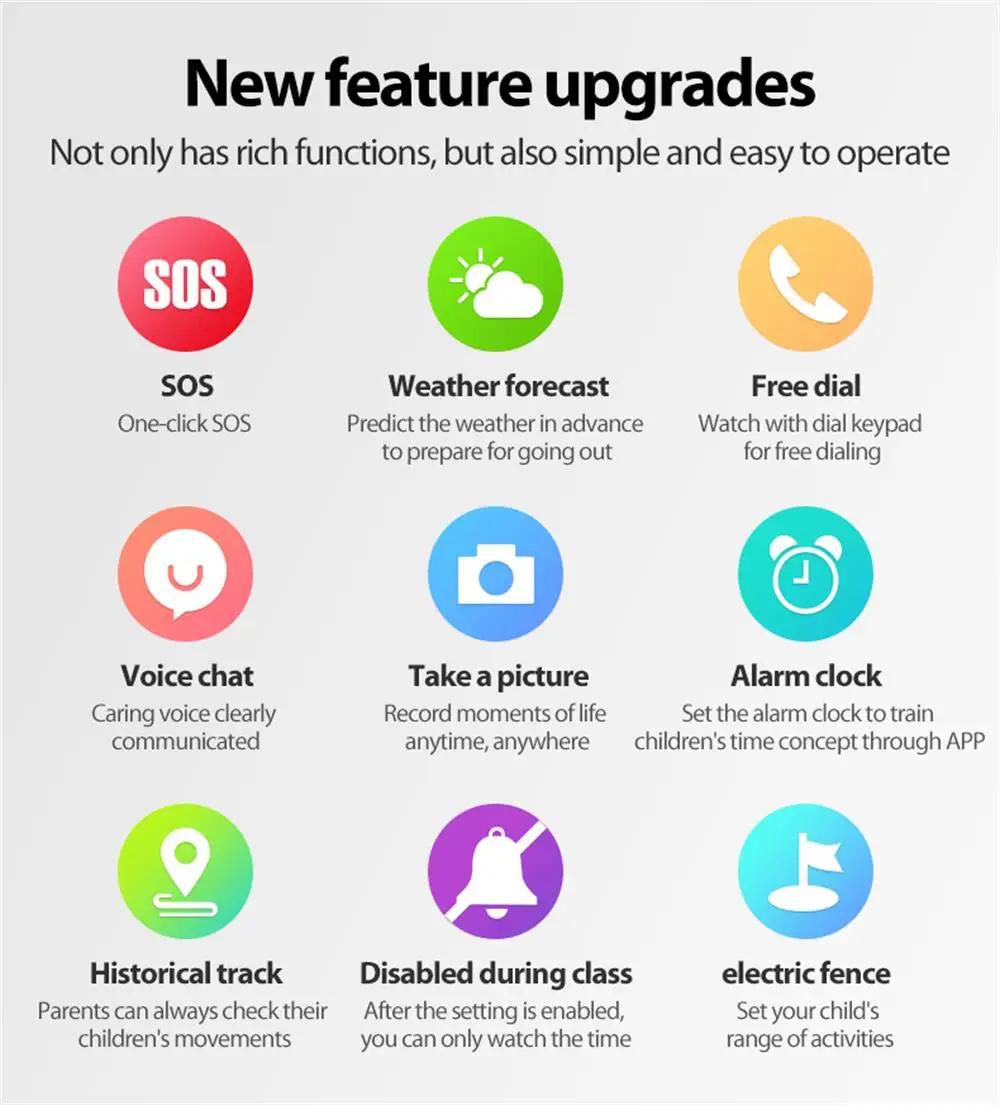 Системные требования: Совместимость с IOS Android Аппаратная платформа: 9820E Комбинация памяти: 2 ГБ + 4 Гб Антенна: FDD: полоса 1 \ 2 \ 3 \ 5 \ 7 \ 8 TDD: Band38 \ 39 \ 40 \ 41 (100 м) WCDMA: полоса 1 \ 2 \ 5 \ 8 GSM: полоса 2 \ 3 \ 5 \ 8; Разрешение экрана: 240*240 Экран Размер: 1,4 дюйм (ов) Сенсорный экран: 1,4 дюймов полный сенсорный экран Емкость аккумулятора: 730 мАч Время работы в режиме ожидания: 76 часов Время работы: 48 часов Физическая кнопка Два: кнопка переключения, кнопка SOS Фото: Поддержка, 30 Вт Sim-карта: Nano sim-карта Динамик: 1609 Динамик Язык: эти сетевые часы 4G поддерживают многоязычные часы, включая английский, русский, испанский, польский, португальский, турецкий, итальянский, французский, немецкий, тайский Интерфейс зарядки Магнитная Зарядка Водонепроницаемый рейтинг IP67
