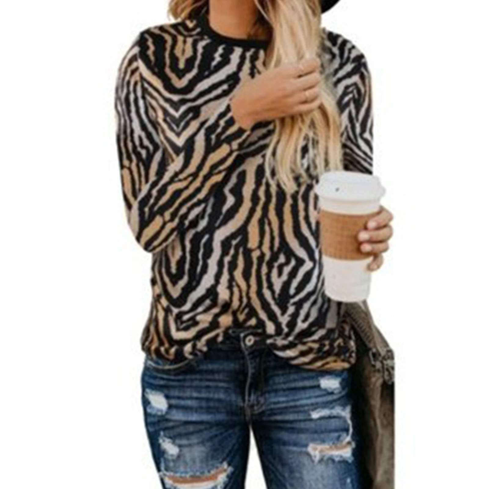 Модная женская блузка с круглым вырезом и длинными рукавами, Леопардовый свитер в полоску