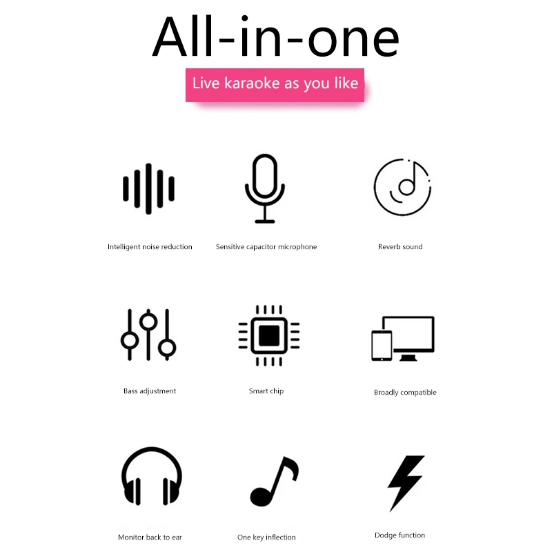 Чип звукового эффекта, регулятор настройки, виды звуковых эффектов, устранение звука, пение в режиме реального времени, избегание одной кнопки, мониторинг в реальном времени, аккумулятор большой емкости.