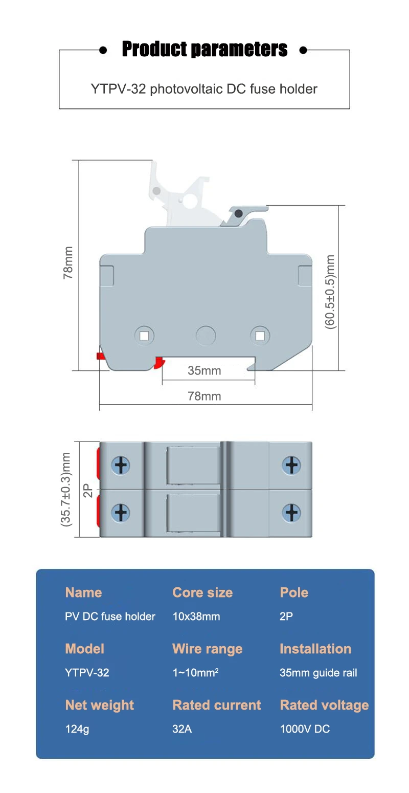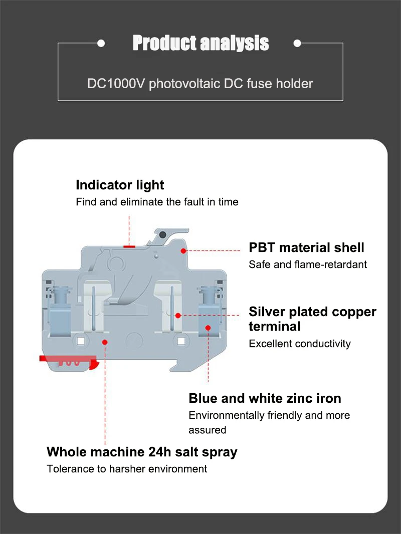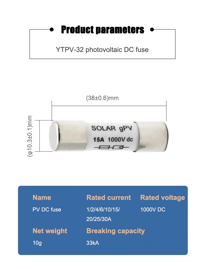 Этот держатель подходит для фотоэлектрических предохранителей с номинальной мощностью 3A, 10A, 15A, 20A, 25A и 30A. Максимальное напряжение 1000 В. Держатель предохранителя можно комбинировать со следующимPV струнные предохранителиЧто является необходимой защитой для солнечных панелей.