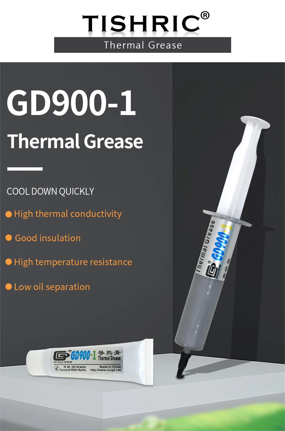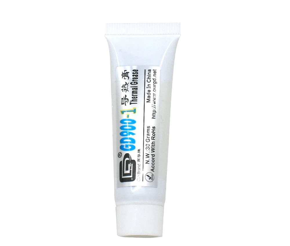 GD900-1 термопаста: Цвет: серый Удельный вес: 2,5 г/см3 Теплопроводность: 6,0 Вт/м-K Рабочая температура: -58 ~ 248 градусов по Фаренгейту GD900-1 Более вязкая термопаста, но ее легко размазывать. Пожалуйста, размажьте его равномерно, как толщина бумаги формата А4. Лучше выделить Сверхбыстрый охлаждающий эффект.