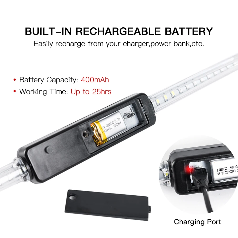 Встроенный аккумулятор кнопочного типа, может работать в течение длительного времени, а также его можно легко найти в темноте и включить или выключить.