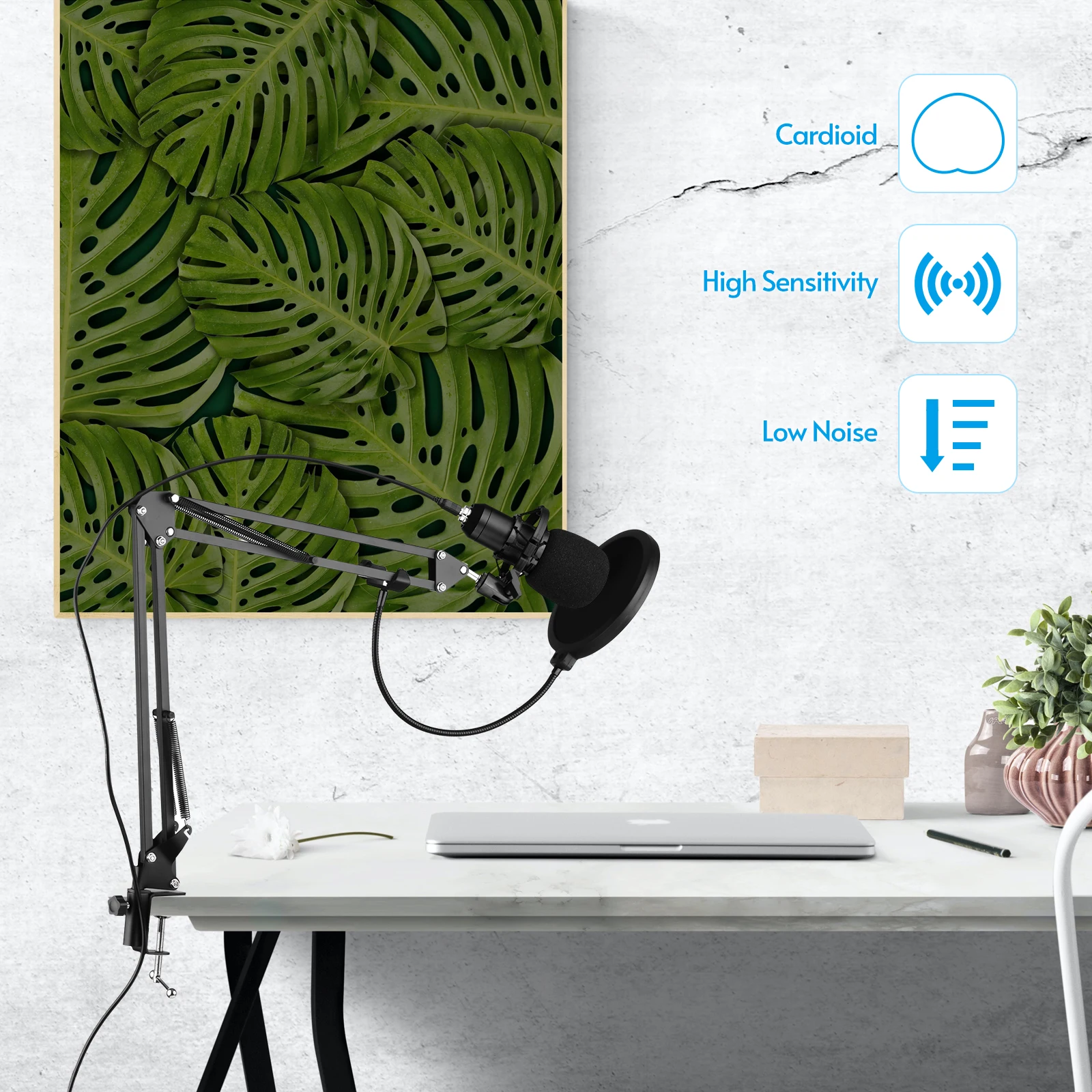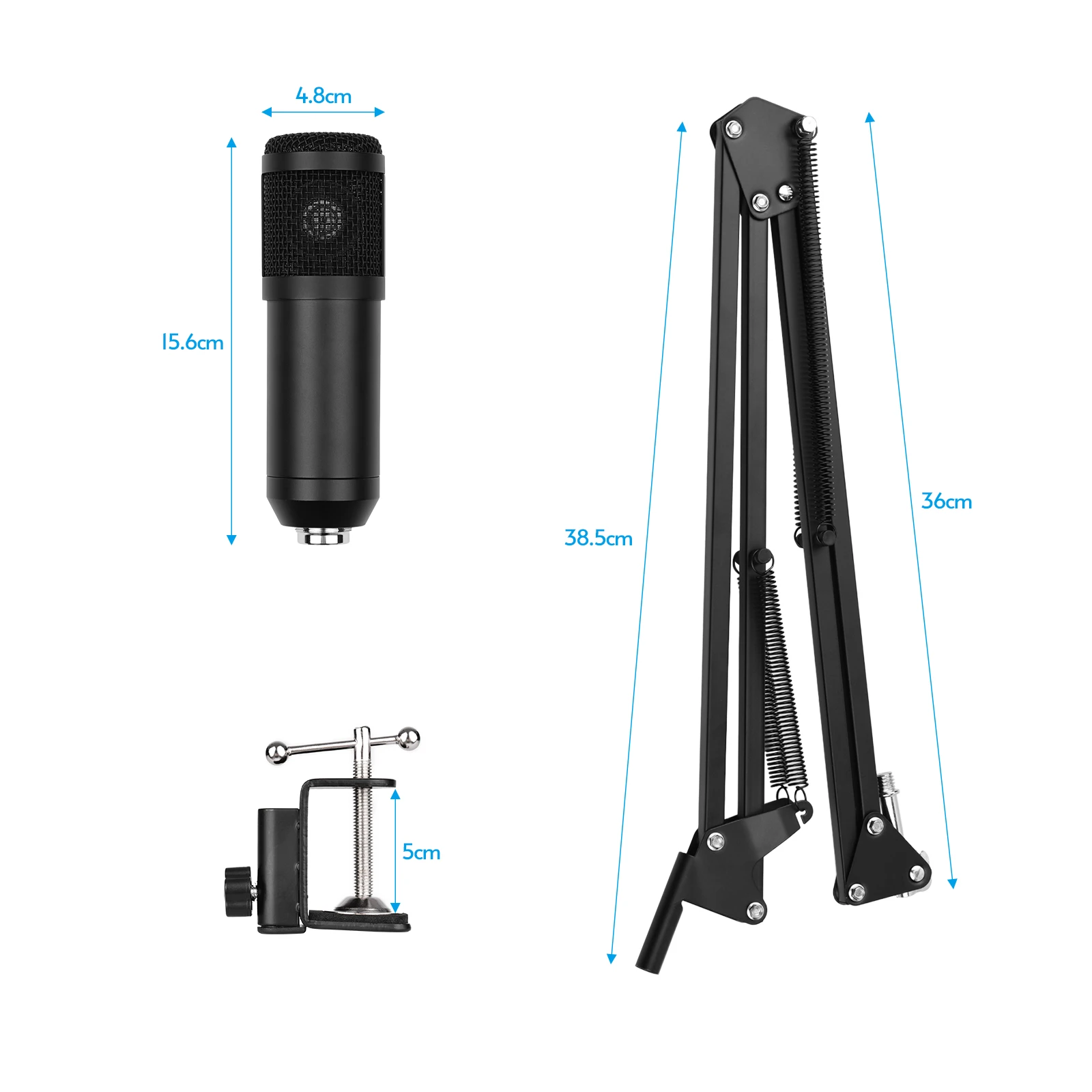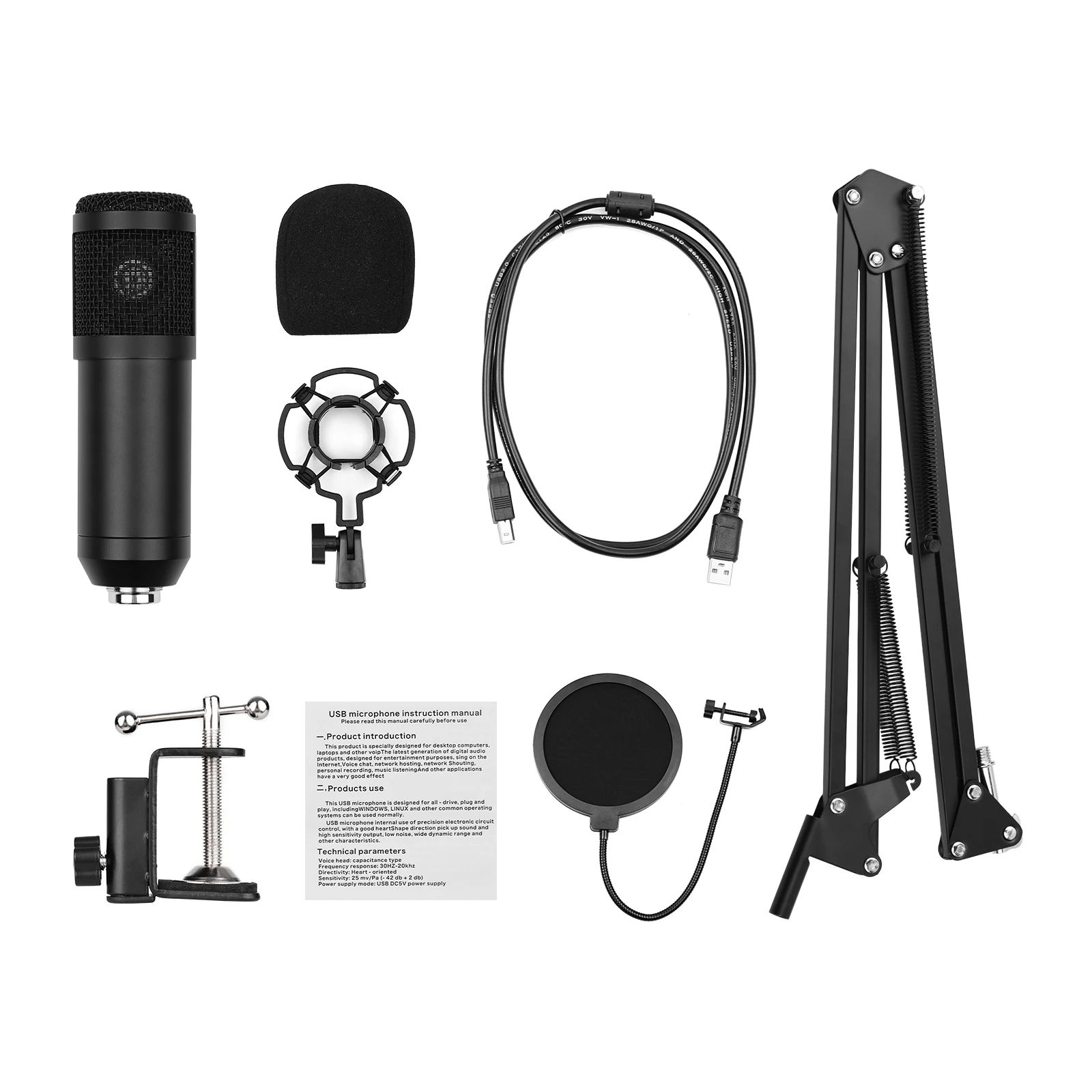 Поставляется с крышкой, поп-фильтром и амортизирующим креплением, снижающим количество хлопов и клещей, тем самым улучшая качество звука; Также поставляется с настольным зажимом, ножничной подставкой и ударным креплением, просты в установке и более удобным для вас, чтобы использовать микрофон.