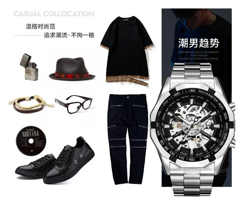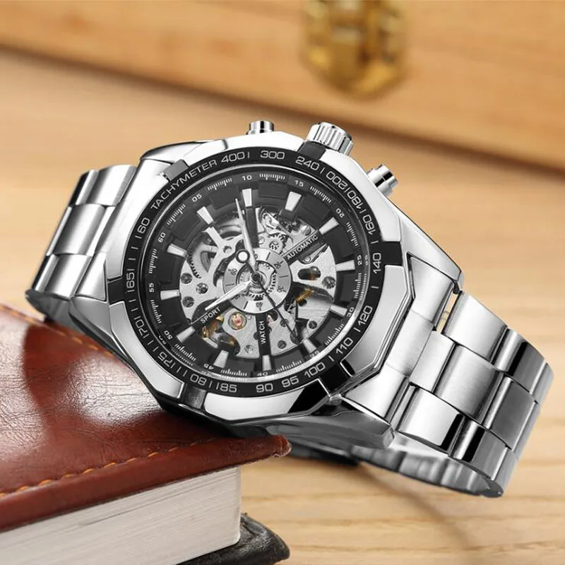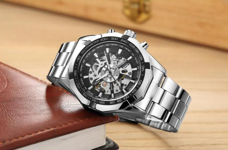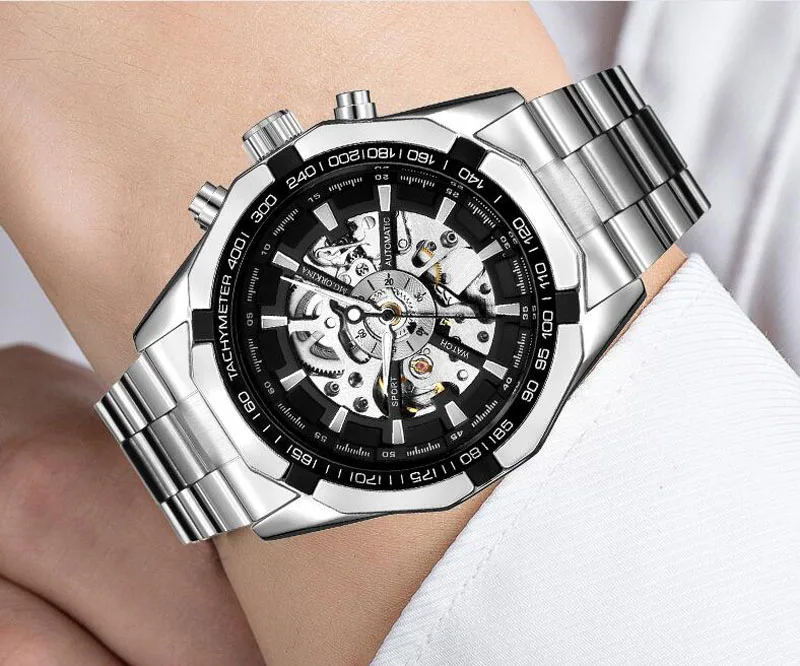 Модные Мужские автоматические механические часы со скелетом, Серебристые часы из нержавеющей стали