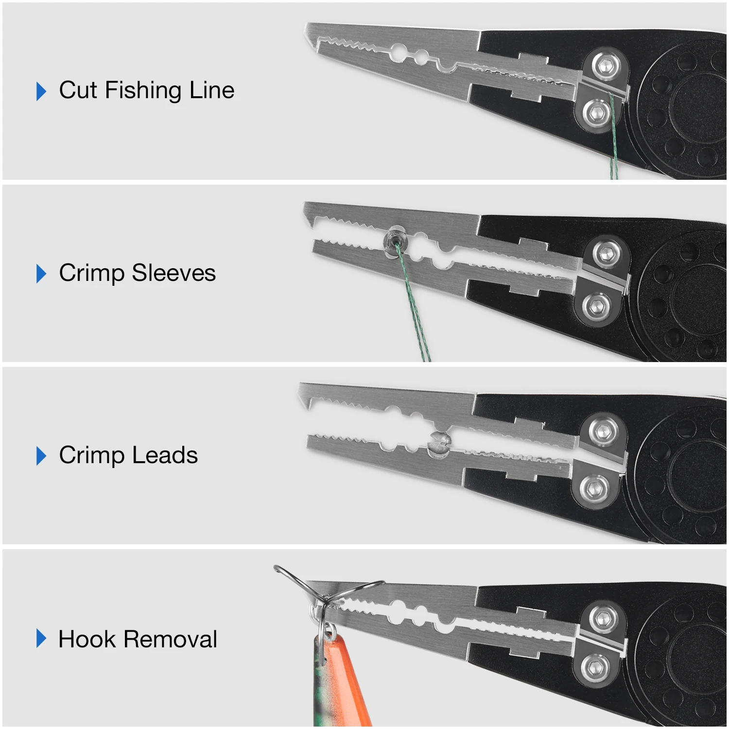 1. Челюсти из нержавеющей стали с титановым покрытием обеспечивают невероятную прочность и долговечность; 2. Авиационный алюминий, анодированный для обеспечения отличной коррозионной стойкости. 3. Машинная резка алюминиевых ручек обеспечивает меньший вес; Эргономичное сцепление обеспечивает больший комфорт. 4. Сменные фрезы из карбида вольфрама обеспечивают чистую линию и Резы проводов. 5. Конструкция кольца с разрезом обеспечивает легкое удаление от приманки или крючка. 6. Поясная застежка с петлями, спиральный трос и тканая нейлоновая оболочка позволяют легко брать с собой.
