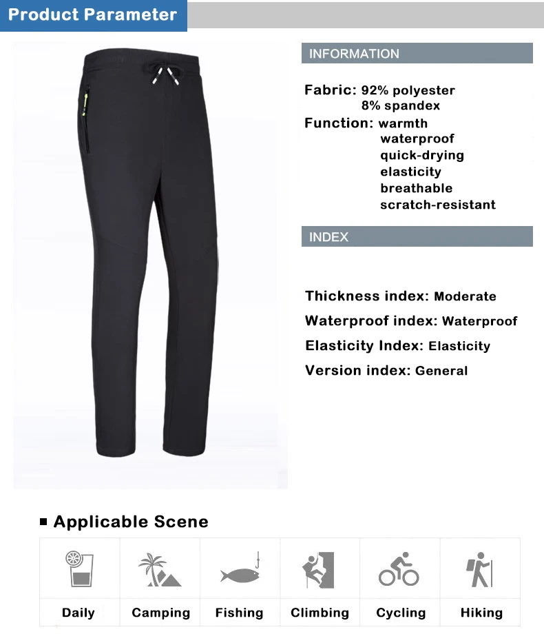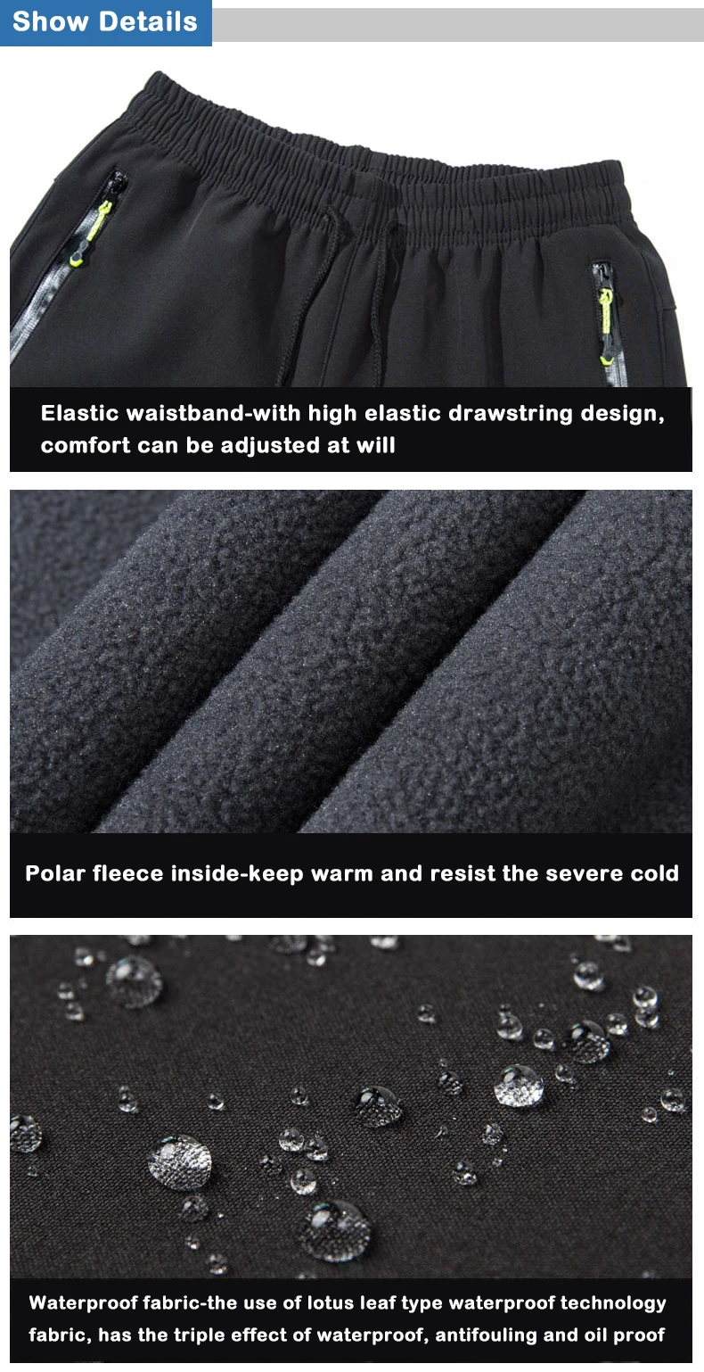 1. Эластичный пояс-с высокой эластичной кулиской, комфорт можно регулировать по желанию 2. Флис внутри-сохраняет тепло и защищает от сильного холода 3. Водонепроницаемая ткань-использование типа листа лотоса, водонепроницаемая технология ткани, имеет тройной эффект водонепроницаемости, противообрастающих и маслостойких