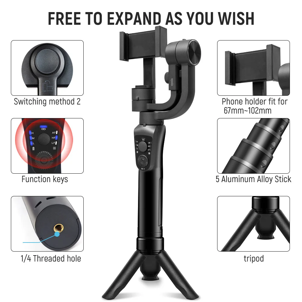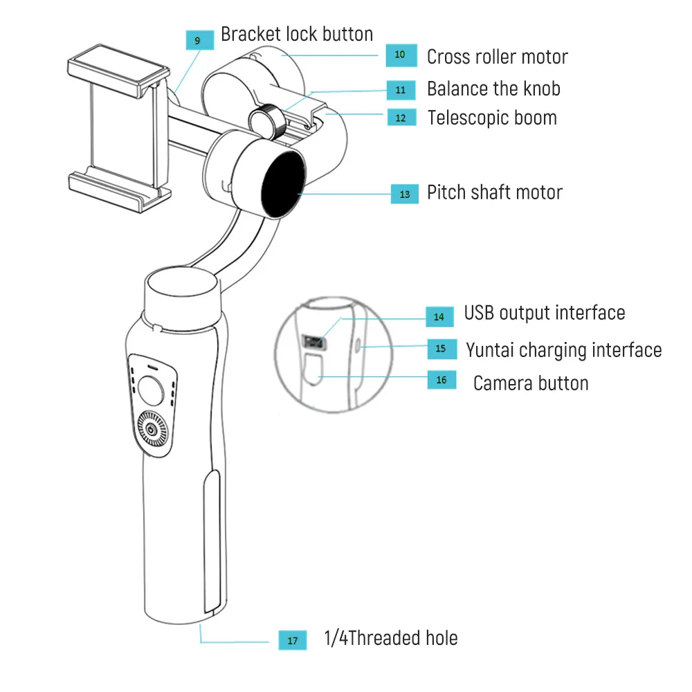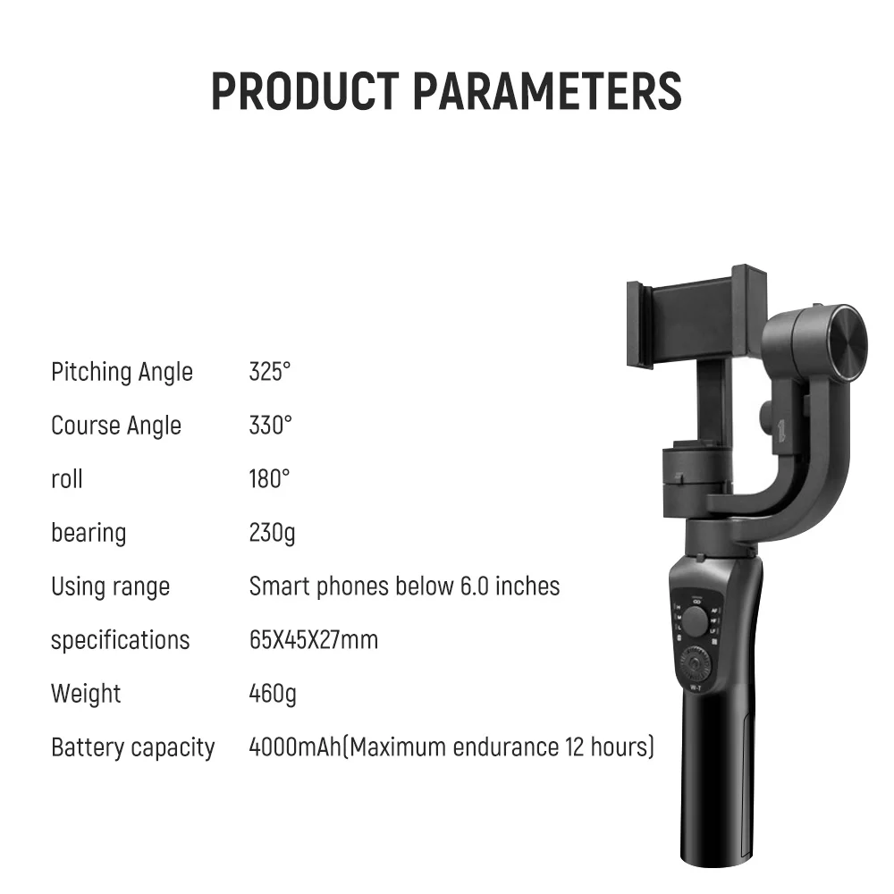 Описание: Универсальный: он может идеально работать с мобильными телефонами, чтобы делать стабильные и гладкие фотографии и видео. Поддержка всех смартфонов GoPro3/4/5/6 камеры. Функция: с функцией автоматического отслеживания и записи видео для распознавания лиц. Особенность: позволяет захватывать более захватывающие изображения с панорамным режимом и умным треком. Регулируемый: вы можете легко изменить направление крепления, горизонтально или вертикально. Простота в использовании: простота в эксплуатации и не требует приложения. Характеристики: Материал изделия: верхняя часть PA, нижняя часть ABS. Угол вращения оси направления/шага/рулона: 330 °/325 °/180 °. Емкость аккумулятора: 4000 мАч. Срок службы 8-10 ч. Функция фокусировки: поддержка. Функция внешней зарядки: поддержка. Мобильный телефон можно заряжать через кабель передачи данных. Отслеживание лиц товара: поддержка. Подключение по Bluetooth: поддержка. Сфера применения: для всех смартфонов 6,0 дюймов и ниже, GoPro3/4/5/6 камеры. Режим следования: фиксированный, полуконтроль, полный контроль. Интерфейс: стандартный интерфейс 1/4 дюйма.