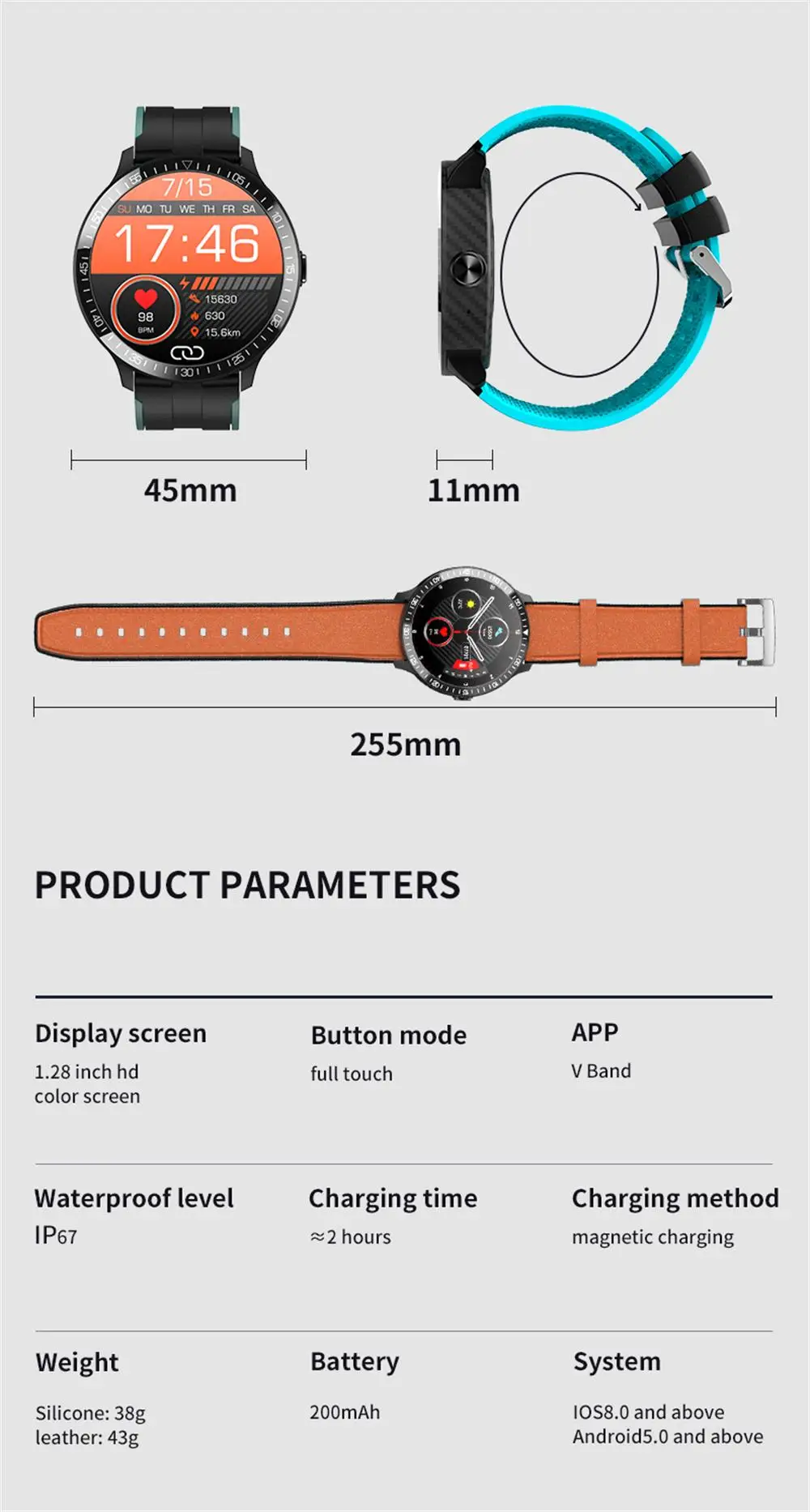 1,28 "на тонкопленочных транзисторах на тонкоплёночных транзисторах с большими кругами, цветной экран, сенсорный wake-up, вызовов через bluetooth, циферблат, блокировка набора, адресной книге, коммуникационная запись, 24 часа в сутки, температура тела, мониторинг, изготовленный на заказ, циферблат, низкая потребеление энергии, пульс, кровяное давление, мониторинг кислорода в крови, несколько режимов упражнений, многоязычный, подсчет шагов, калории, расстояние, Мониторинг сна, режим упражнений, напоминание о звонках, push информации, обзор истории информации, напоминание о будильнике, поднимите руку, чтобы осветить экран, отказ от одного ключа, не беспокоить режим, обмен социальной информацией (WeChat, QQ , Facebook, Twitter) встряхните, чтобы сделать фотографии, двусторонний поиск, обмен информацией о здоровье, OTA