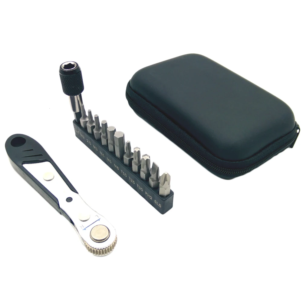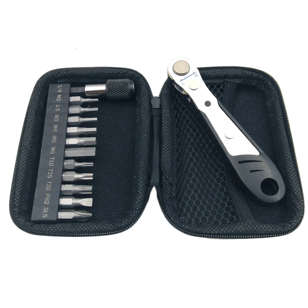 * 1.он изготовлен из высококачественного материала, прочный и практичный в использовании. * 2. Отлично подходит для велосипедных частей или болтов. * 3. В комплект входит: Трещоточный ключ; 2/2.5/3/4/5/6 мм шестигранных ключей; T10, T25 и T30 крутящего момента; Переходник: слот SL5, PH2; Быстрый замок магнитный расширение стержня. * 4. В комплекте черный чехол для хранения.