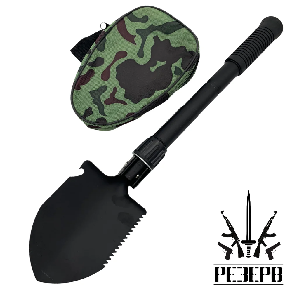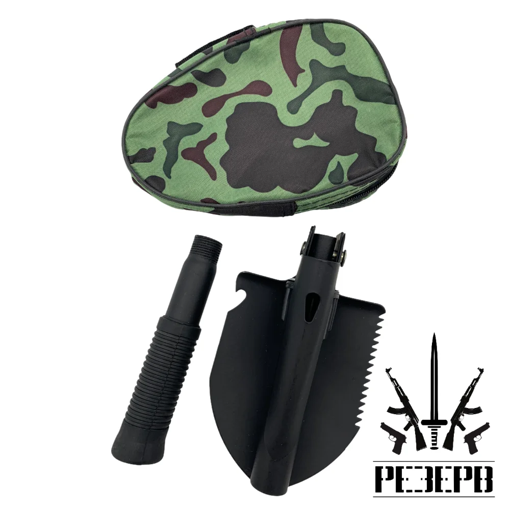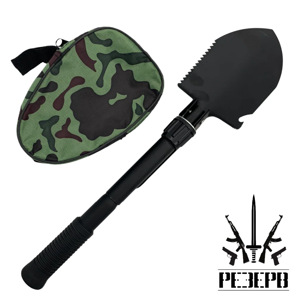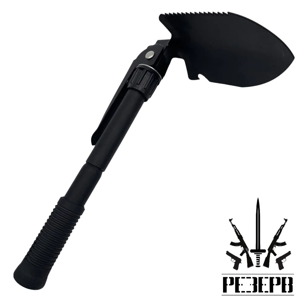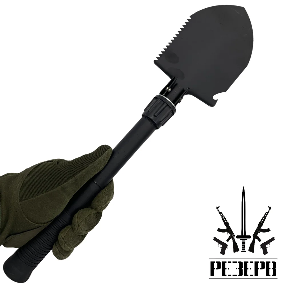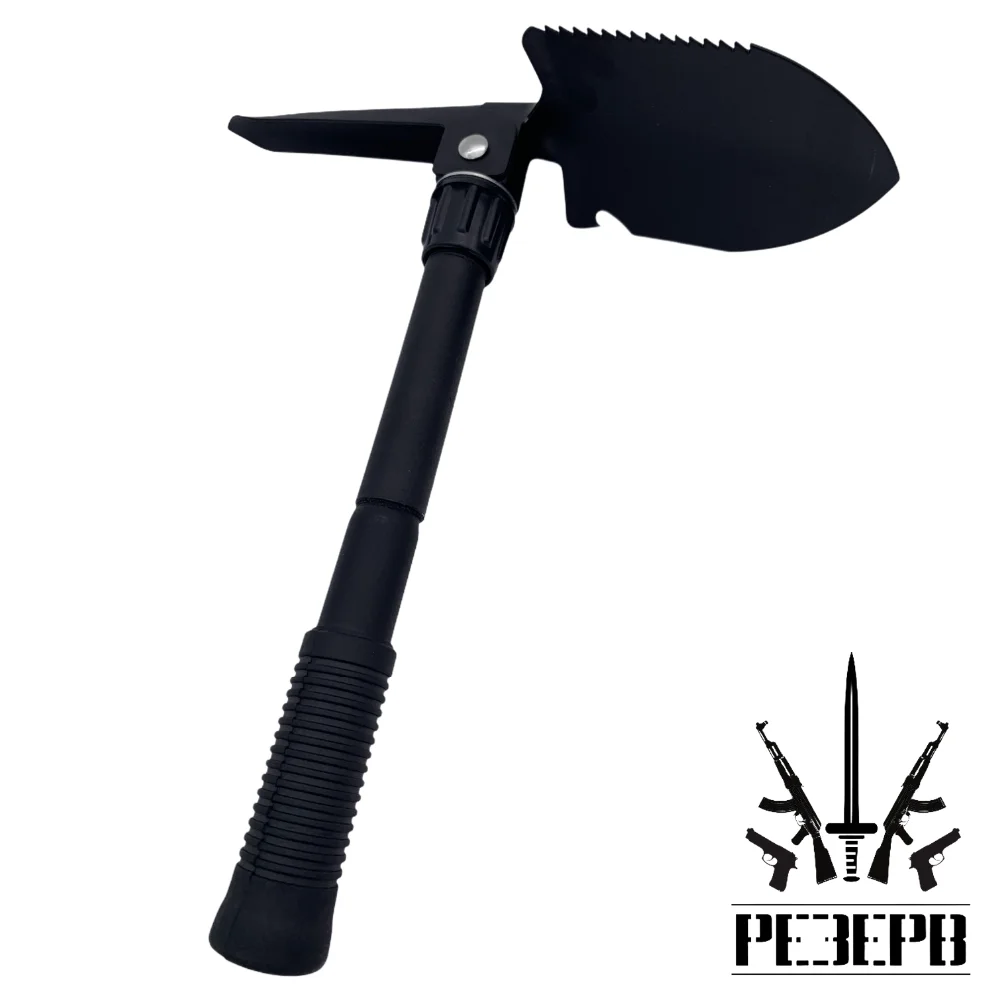 Лопата имеет зубчатую часть (пила), открывашку для бутылок, а также складную насадку "кирка".