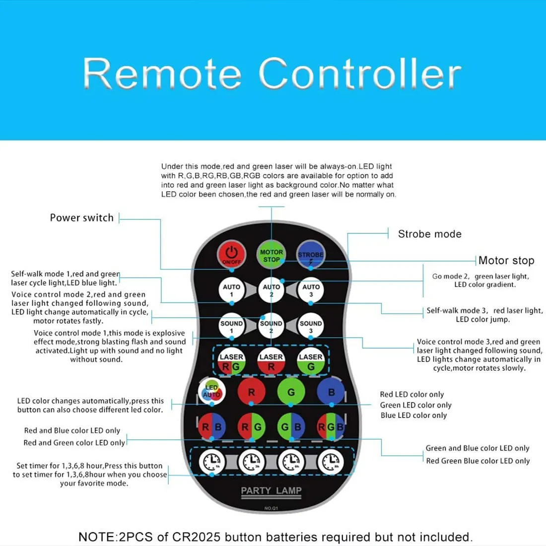 7. Многофункциональный пульт дистанционного управления: стробоскоп с голосовым управлением, динамический режим голосового управления, лирический режим голосового управления, красный узор с подсветкой, зеленый узор с подсветкой, красно-зеленый узор с подсветкой, RG узор красный-зеленый-синий, G рисунок один зеленый, R узор один красный