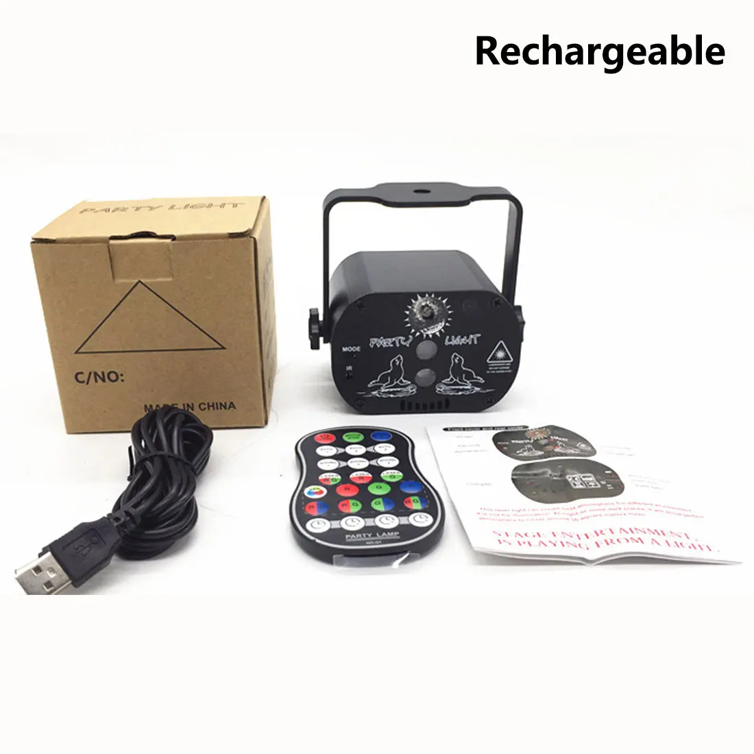 5. Зарядка через USB + интеллектуальное Голосовое управление + Портативная установка + красный и зеленый лазер + несколько узоров + инфракрасный пульт дистанционного управления
